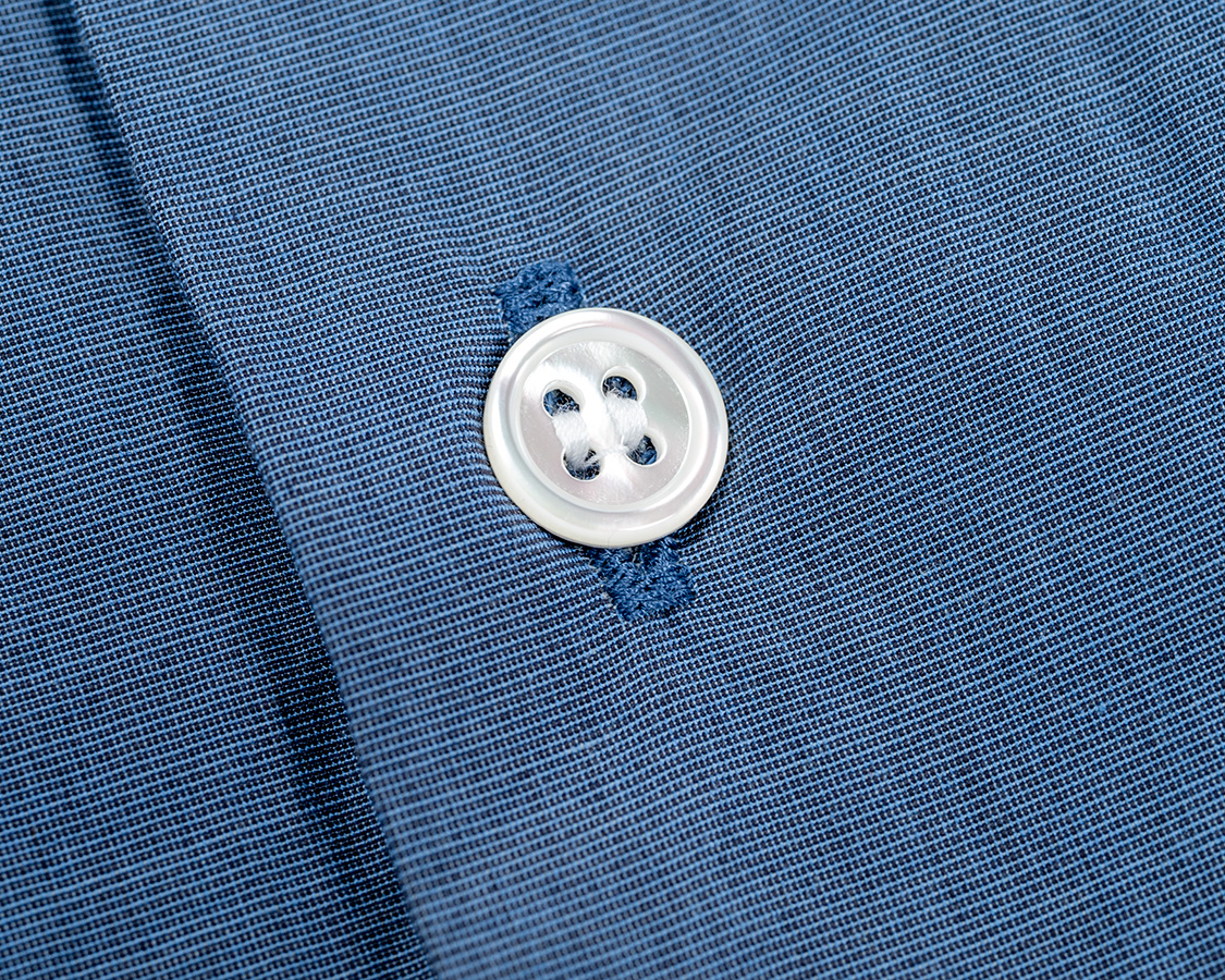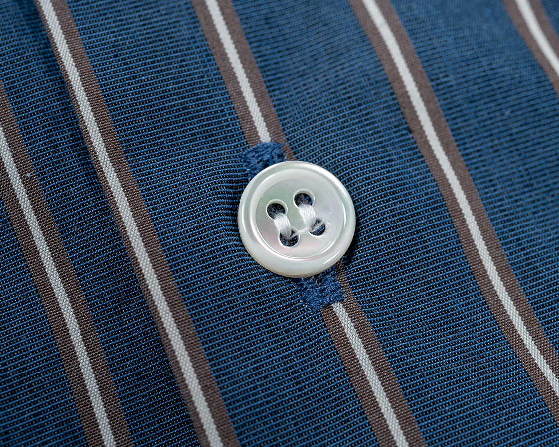 フロント、前立ては無く身頃を三つ折りしてホールで止める。このあたりがアメリカ物のシャツと違いを感じる部分。ステッチが無い分、シンプルかつドレスウェア的な雰囲気。ボタンは高瀬貝。なので、洗う時はネットに入れてください。