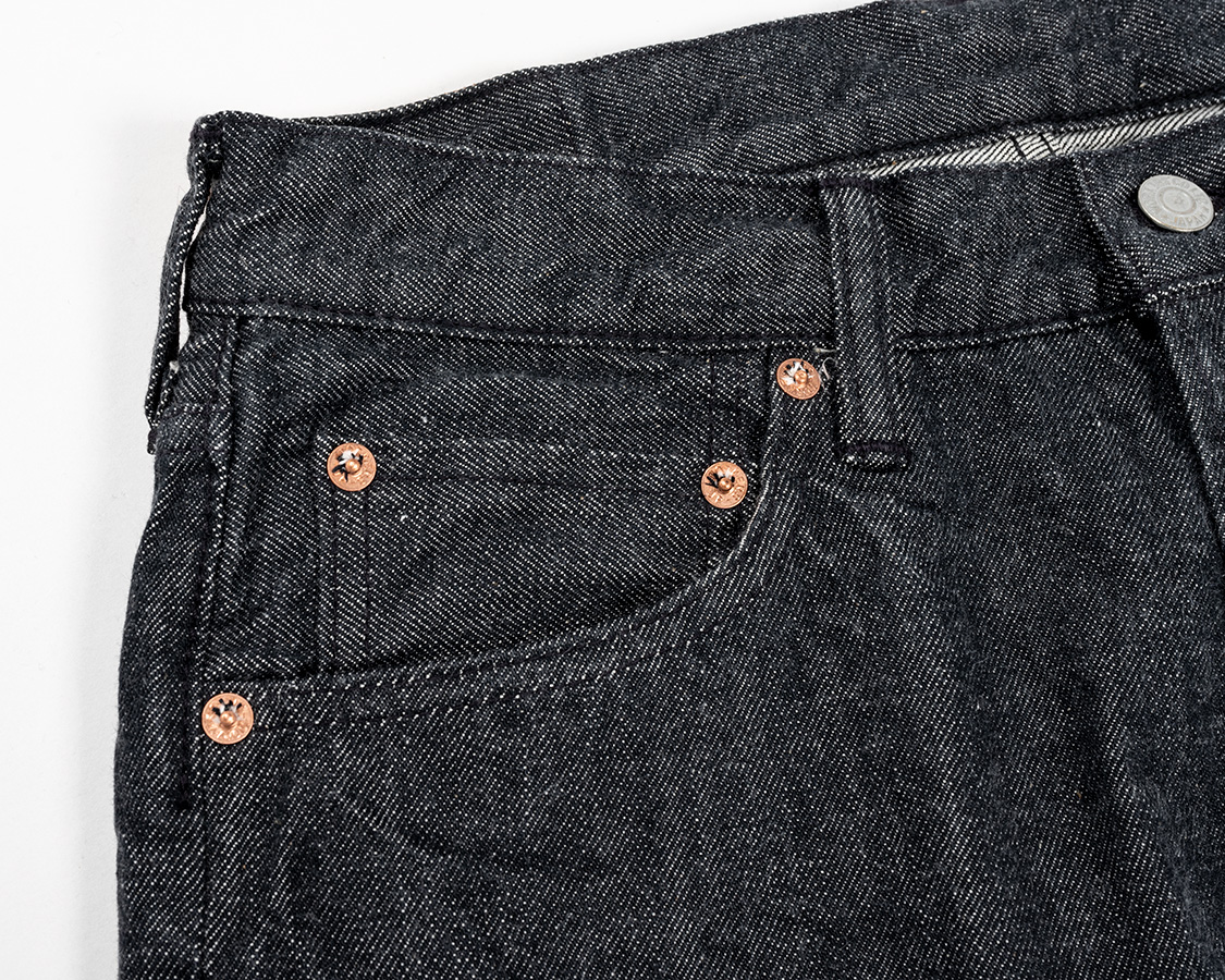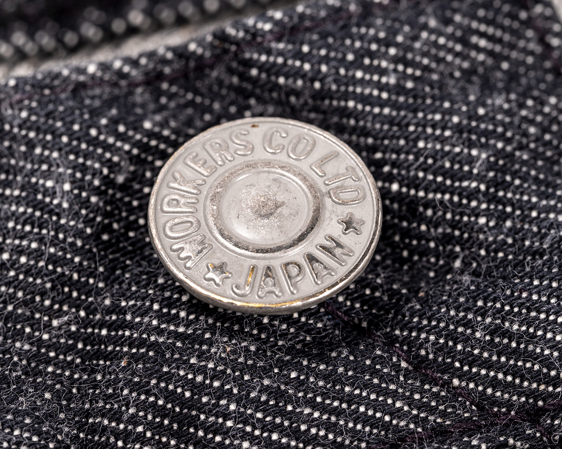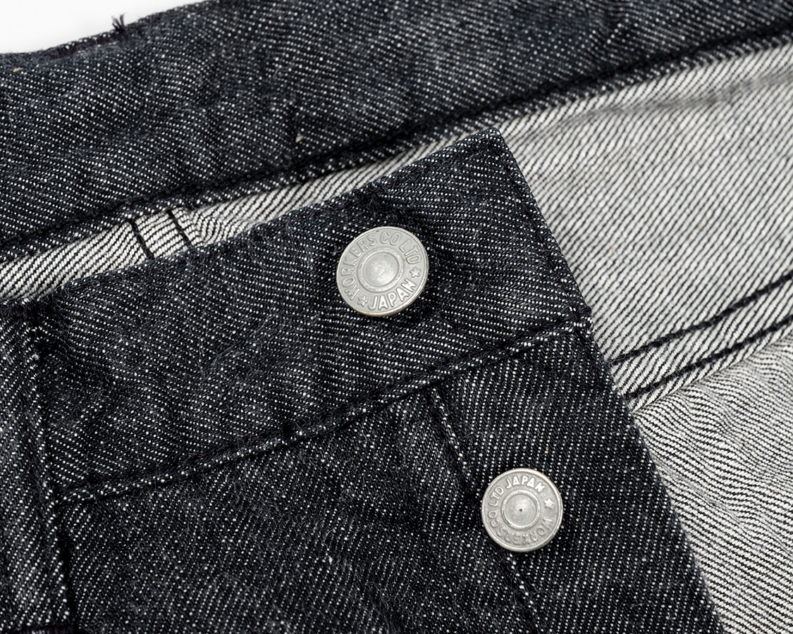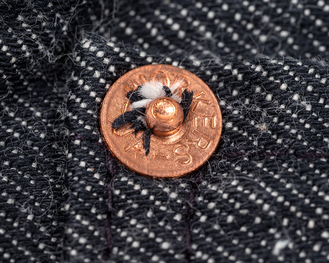 リベットのアップ。生地をいかにも「打ちぬきましたよ!」と一部出てくるリベット。これがわざわざこうなるように「規格」として作るのだからYKKさんも中々、ビンテージ心がわかってくれています。いや、もともとスコービルジャパンだったんだから、スコービルがわかっていたのか?