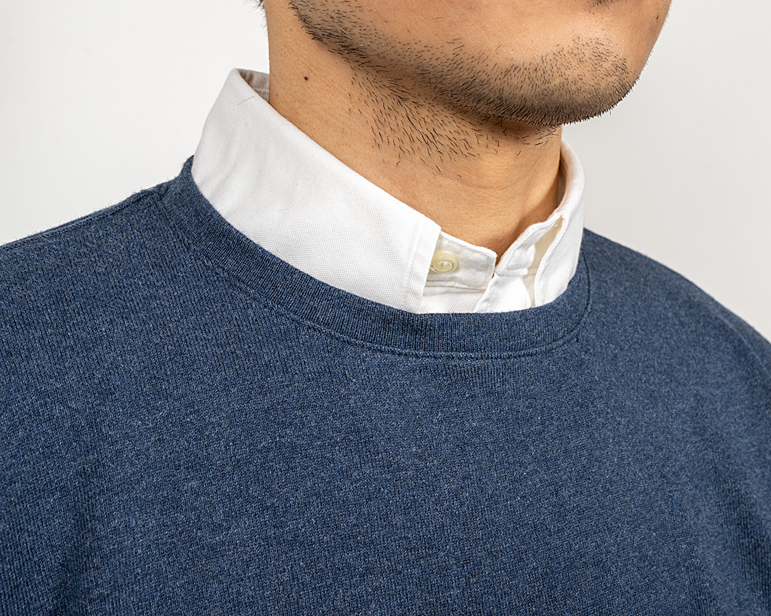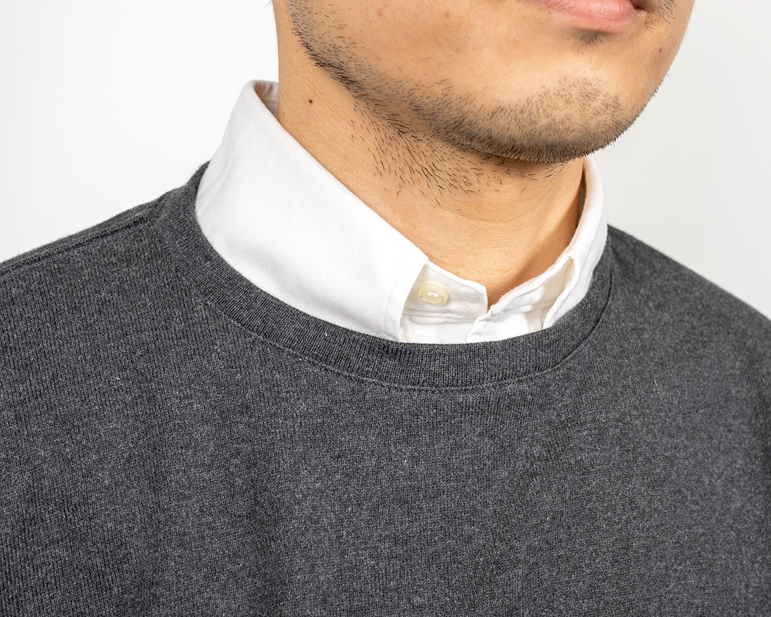 そのベストバランスがこの写真。シャツの上に着て、ちょうど首回りがきつすぎず、緩すぎず。