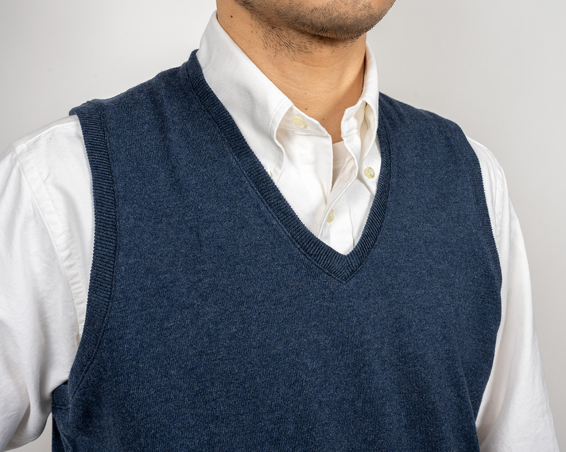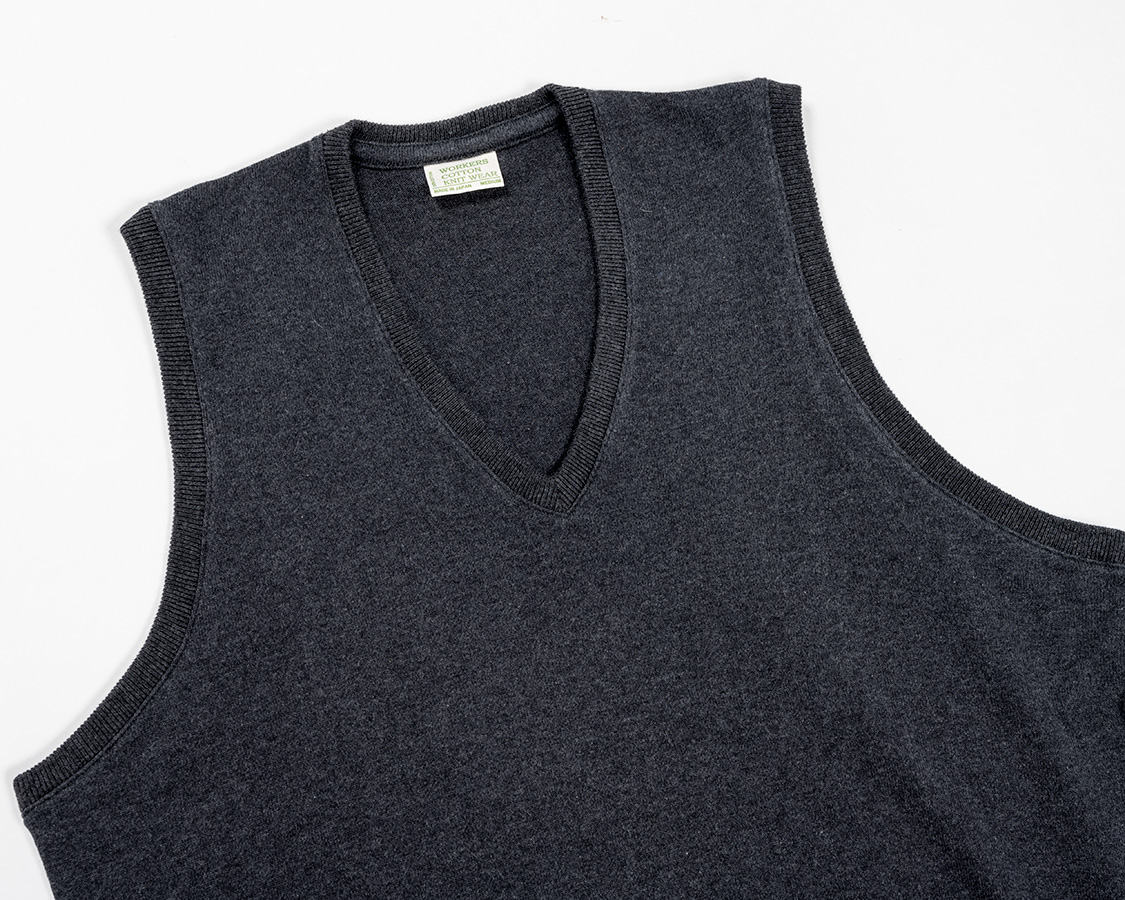 前V以上に大事なのが袖ぐり。ここも、袖本体より少しだけ袖ぐりのフライス(リブ)を短くして。フライスがその短い寸法に戻ろうとする力で体に適度にフィットさせています。