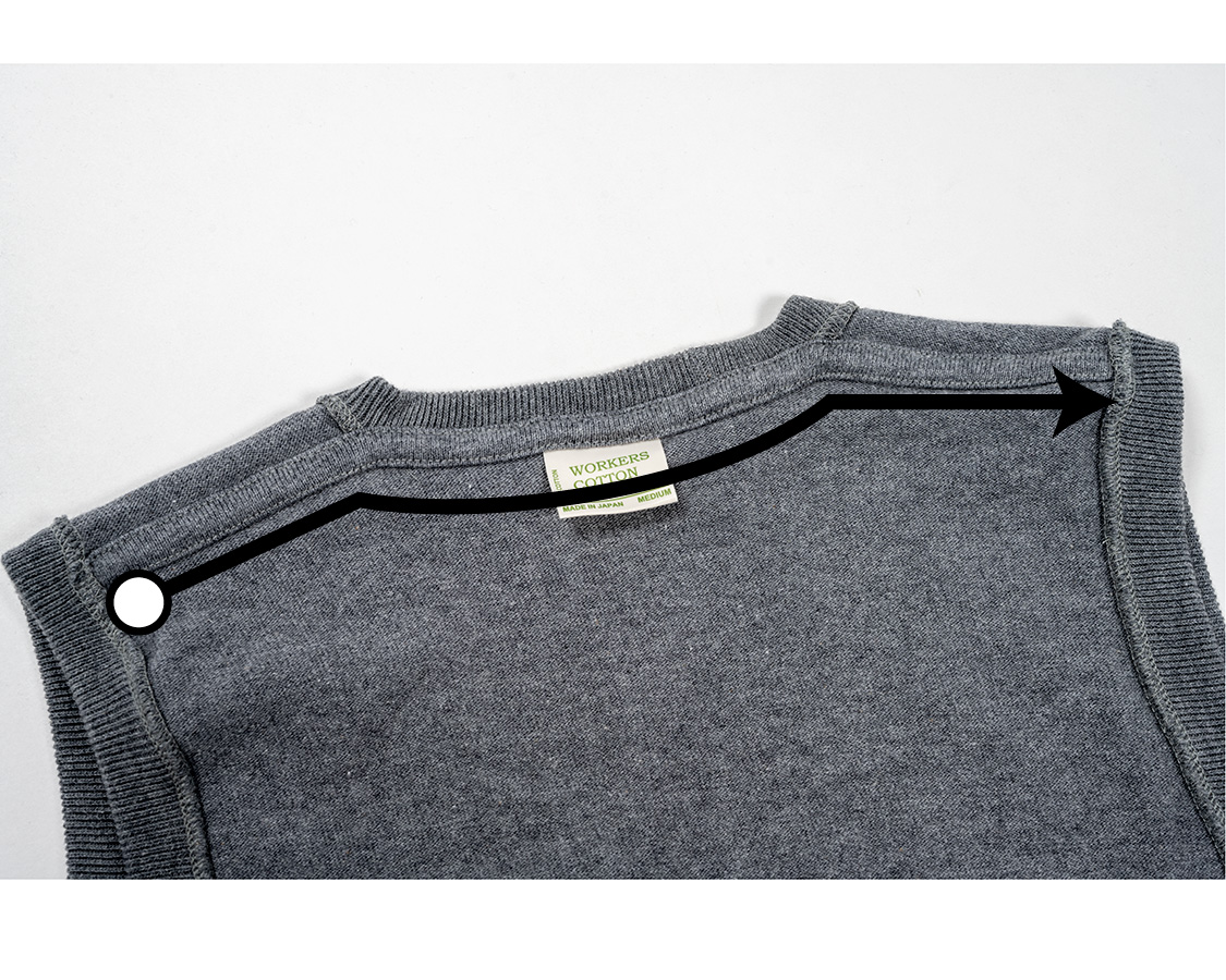 前Vの突端。身頃の天竺、首回りのフライス、編みが違うのが良くわかります。