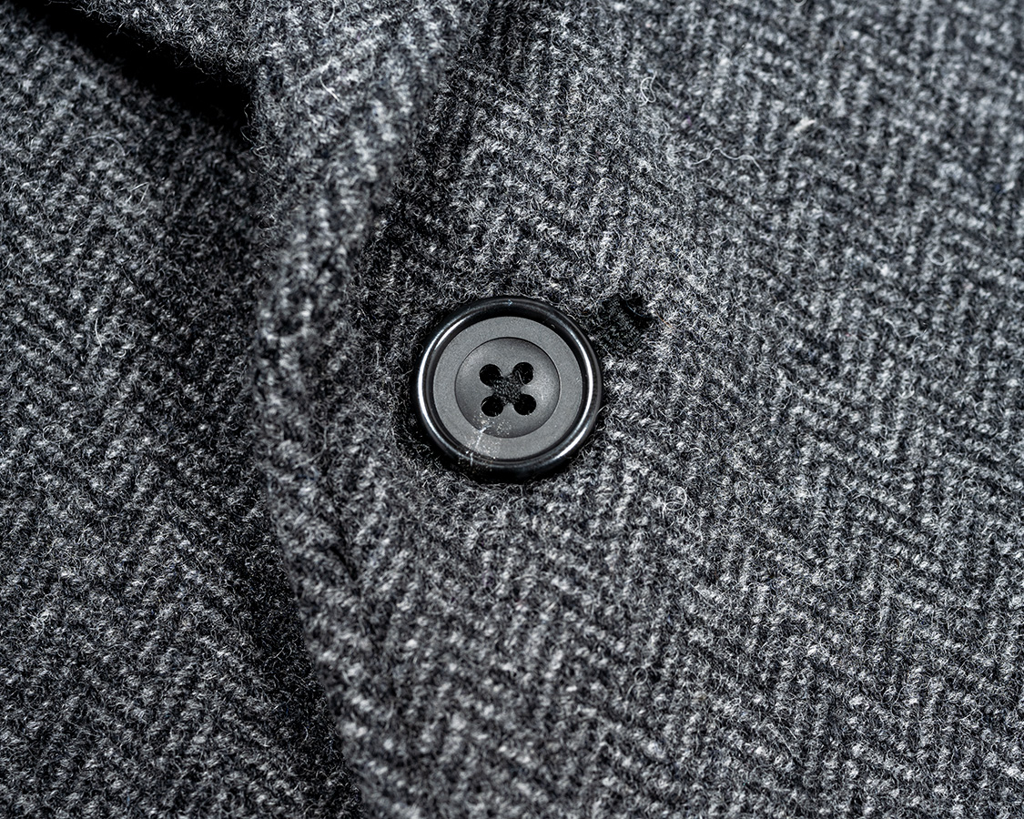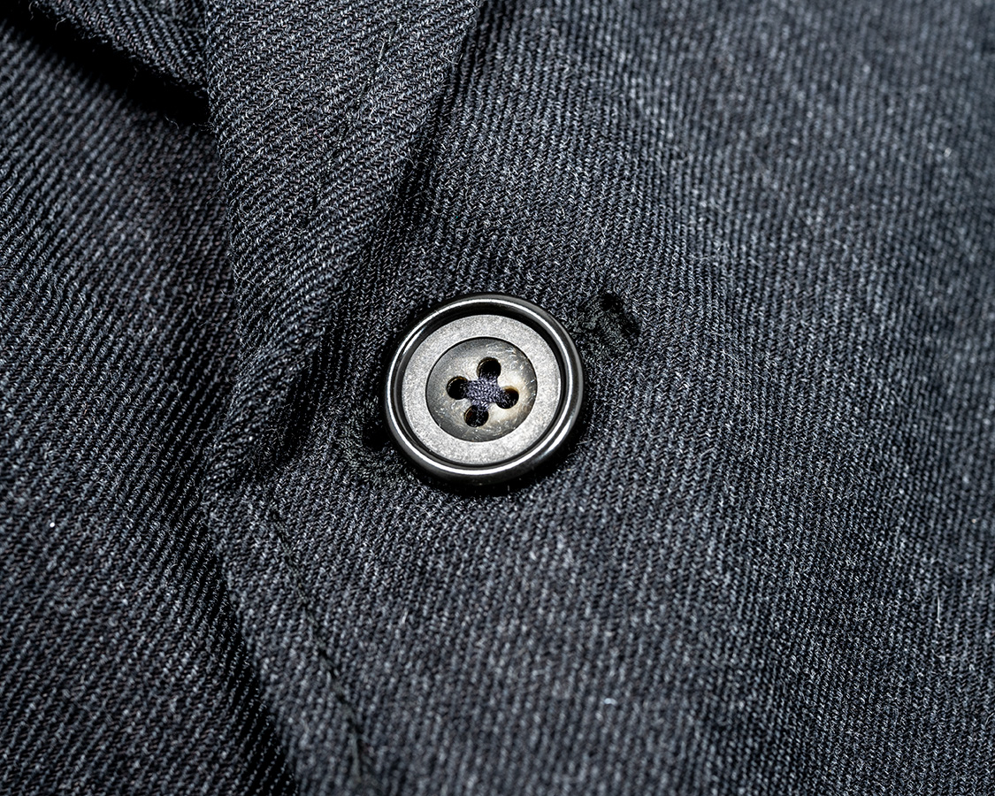 今回は三つボタン、上二つ掛け。ラペルロール部分のボタンアップ。