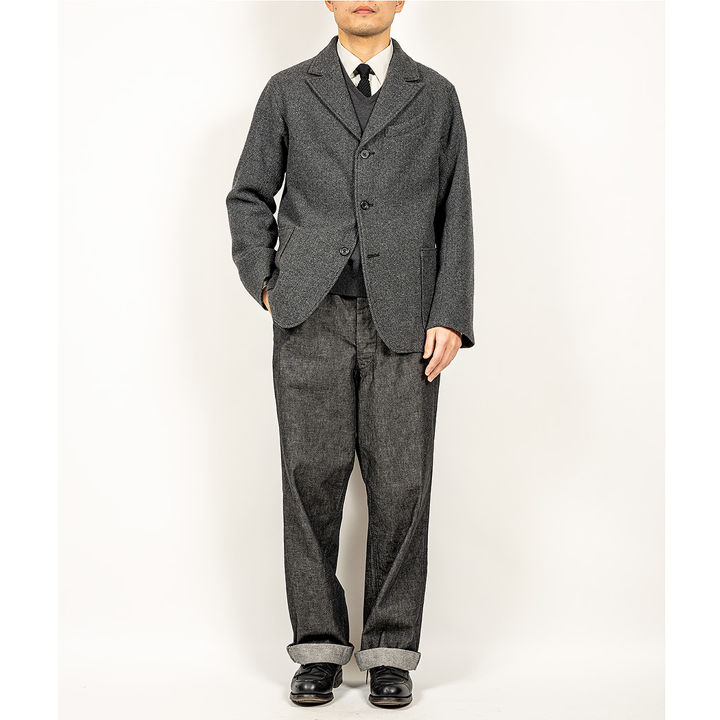 フロント、三つボタンの上二つ掛け。胸の箱ポケはカーブ。腰ポケットはフラップ無し・裏地付きのパッチ。背面はセンターフックベント。アメリカ物のようで、でもピークド。