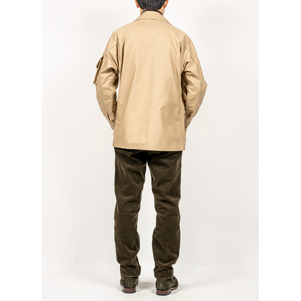 コットンサテン二色はどちらも10 オンスクラス。M-51リプロで作った目の細かいバックサテン。東京なら中に着るものを工夫すれば真冬まで着られる生地。中にRAF Cotton Sweater のような厚手のカットソー、マフラーを巻いて手袋をすれば万全。