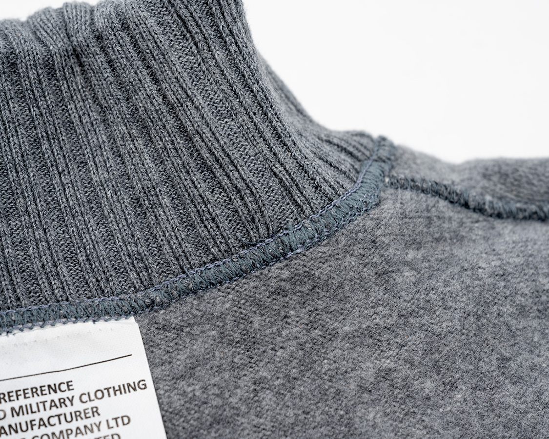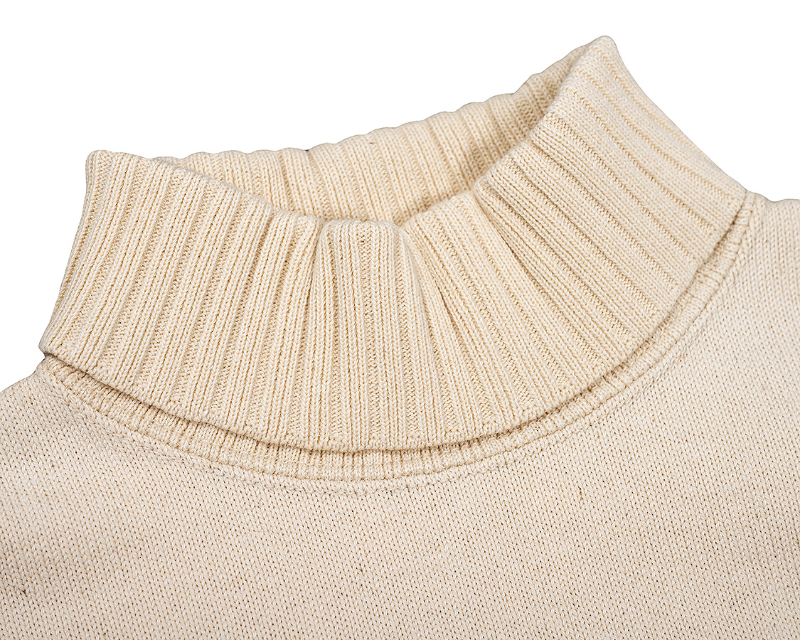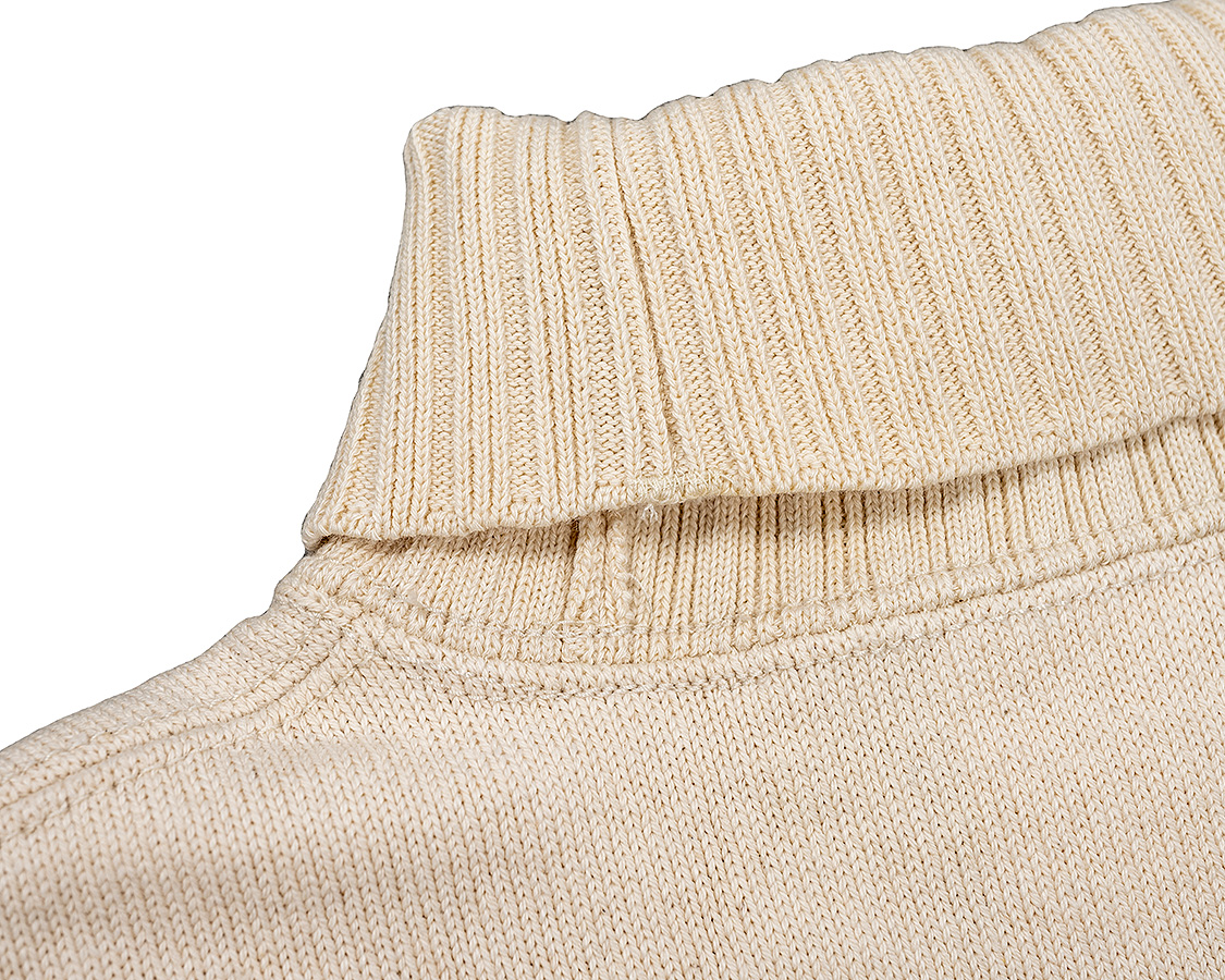 折返りのロールネック。きつすぎず、緩すぎず。高さも大事で、日本人はどうしても欧米人のように首が長くない。低すぎると、せっかくのロールネックがモックネックのようになってしまう。結局、パターンを何種類もひき、量産で使うのと同じ生地を用意して試し縫いを繰り返しベストなバランスを探しました。