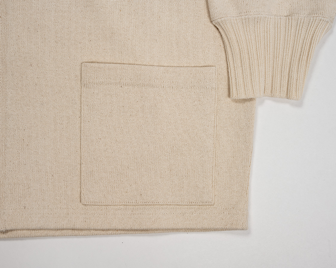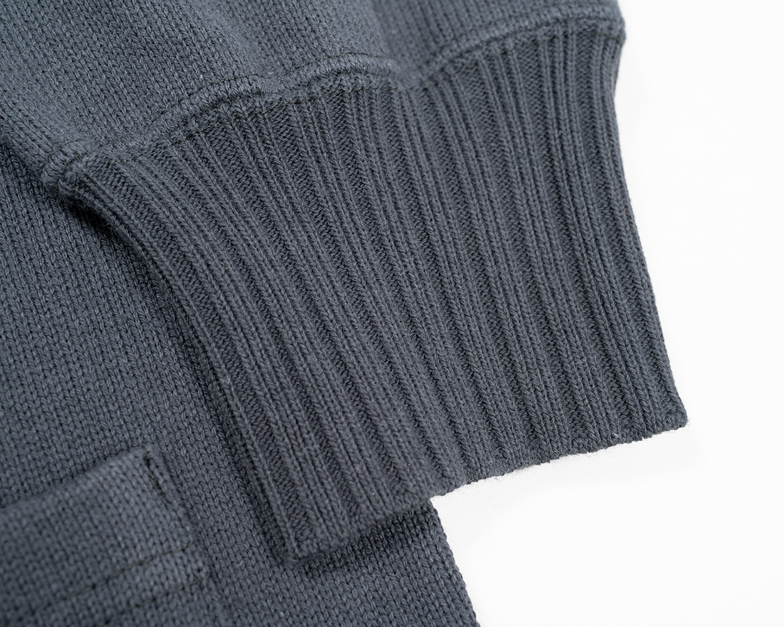 袖口リブは「横編み」という、いわゆるセーターを作るのと同じ編み機で編みます。ポイントは編みどまりを作れること。矢印の部分が編みどまっています。