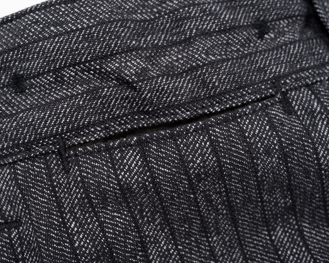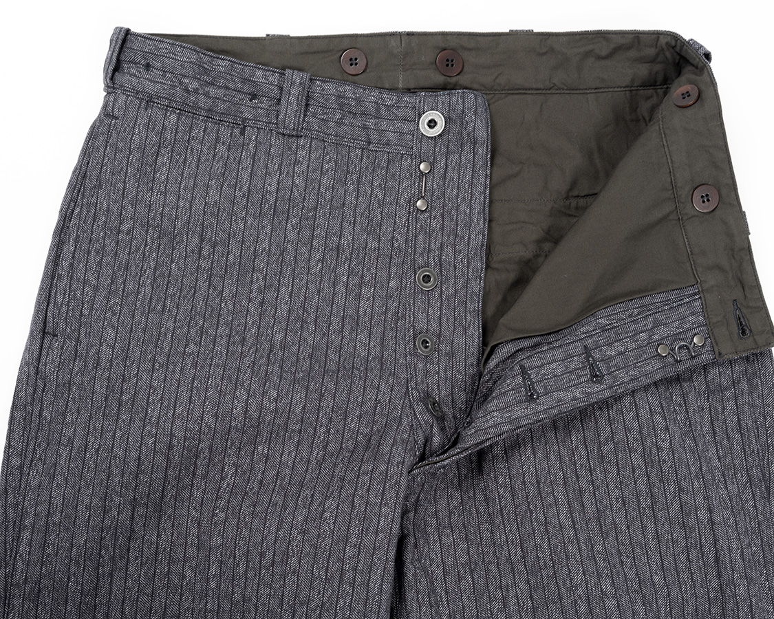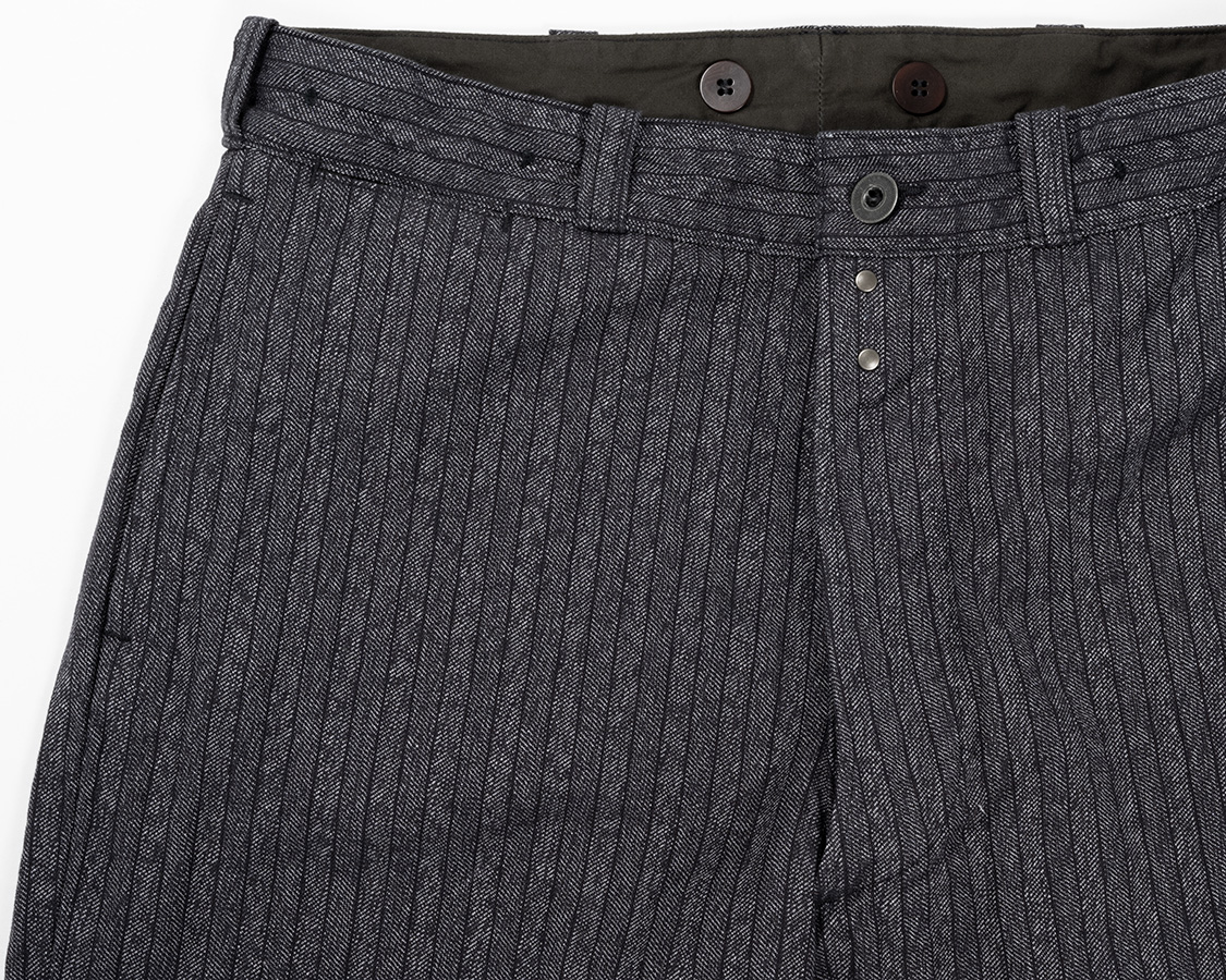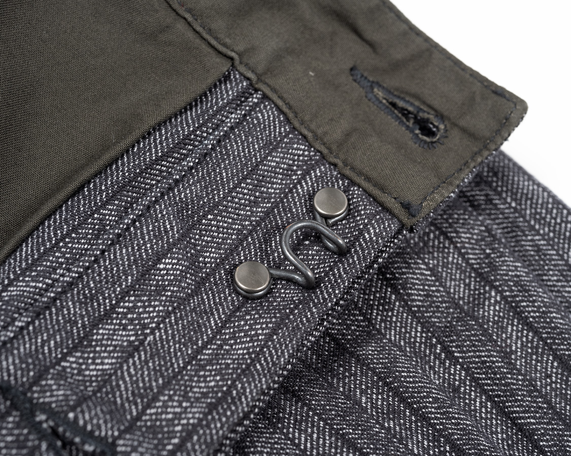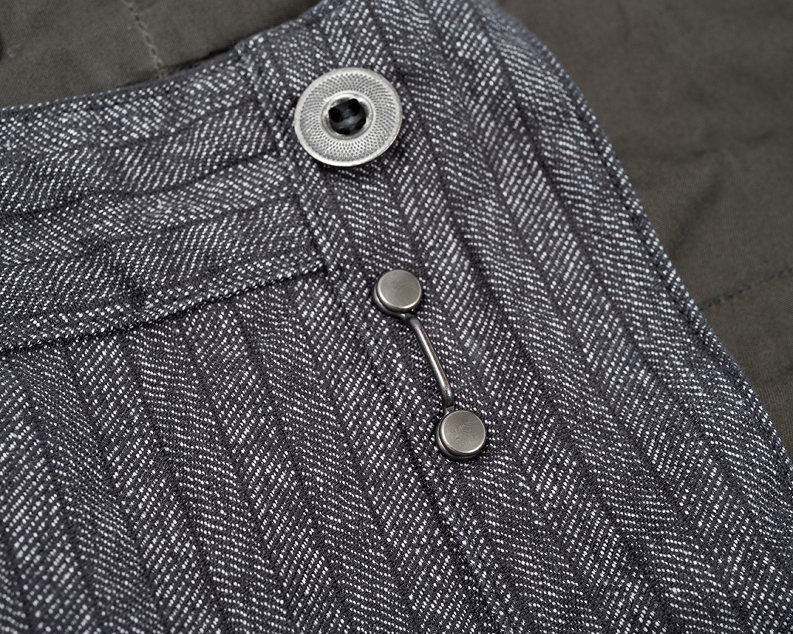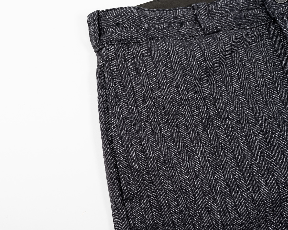 参考にしたおそらくヨーロッパ物だろうなというトラウザーズにならい、フロントはボタン+フック。股上は深め、ウェスト裏にサスペンダーボタンあり。吊った時の雰囲気はやはりとてもクラシック。ベルトで締めたのとは一味違います。