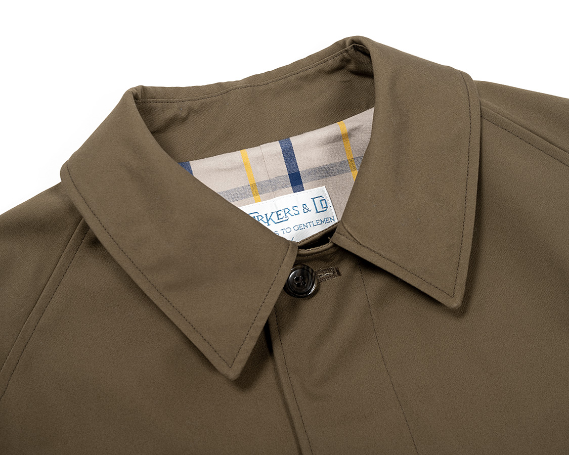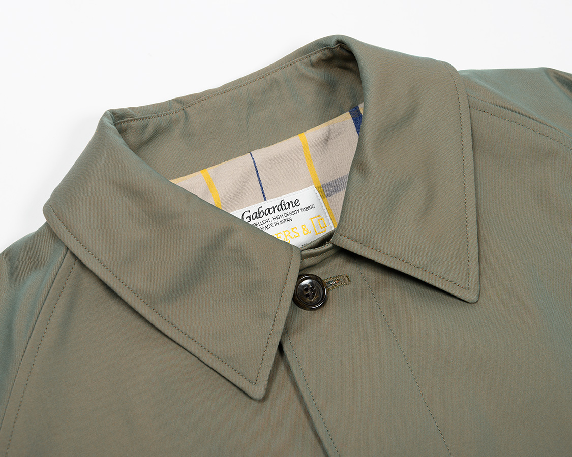 身頃裏、ギャバジンは別注で作っているチェック生地。ビンテージのブルックス、おそらくバーバリーに別注していたのではないか?という一枚を参考に兵庫県・西脇のTAKASEさんの親戚のおじさんに織ってもらったチェックです。