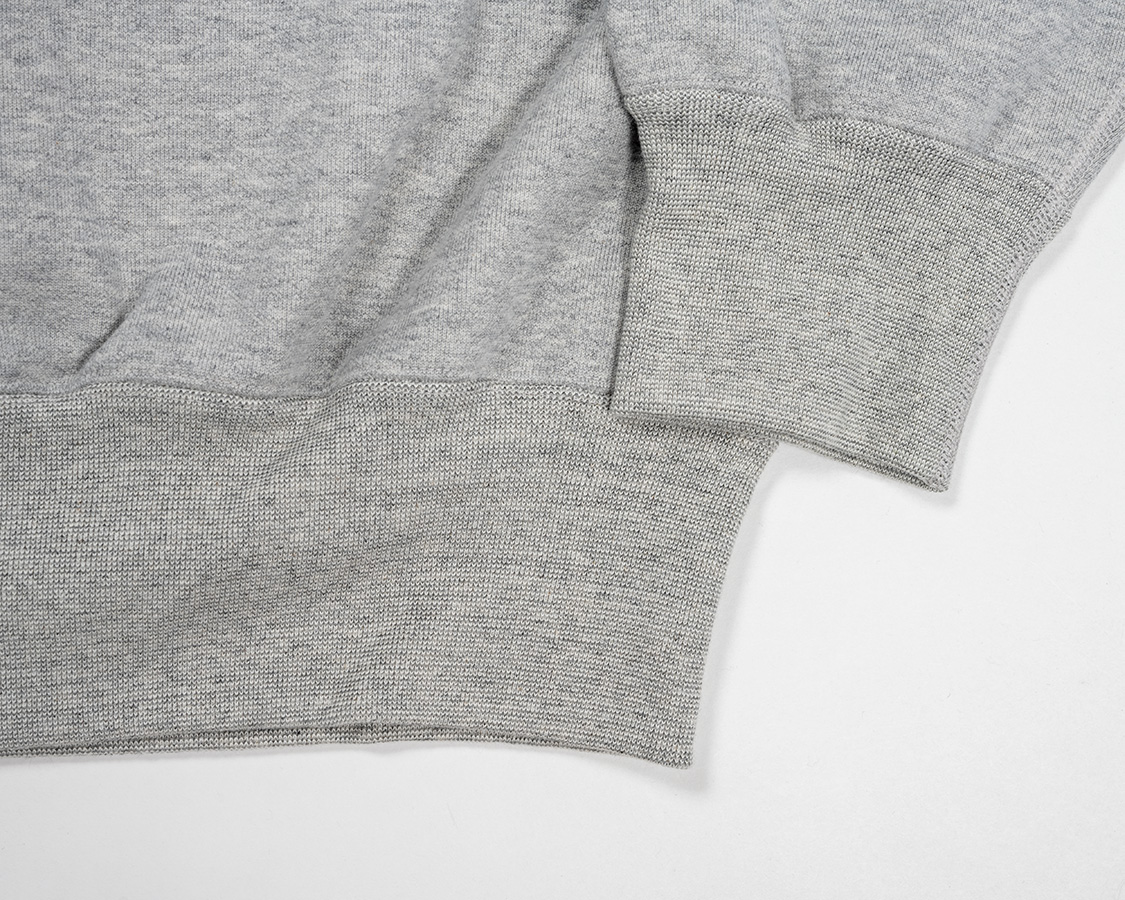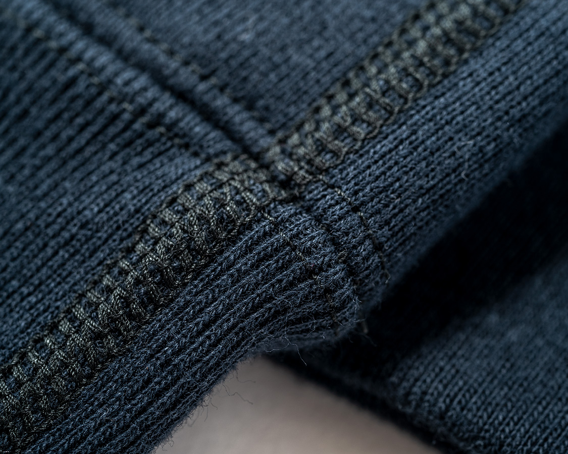 リブも身頃のヘビーオンスに負けない、がっしりした物。袖とリブの取り付けはオーバーロック+またぎ裏振り。リブ、身頃の縫い合わせはフラットシーマー。