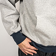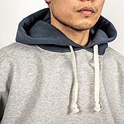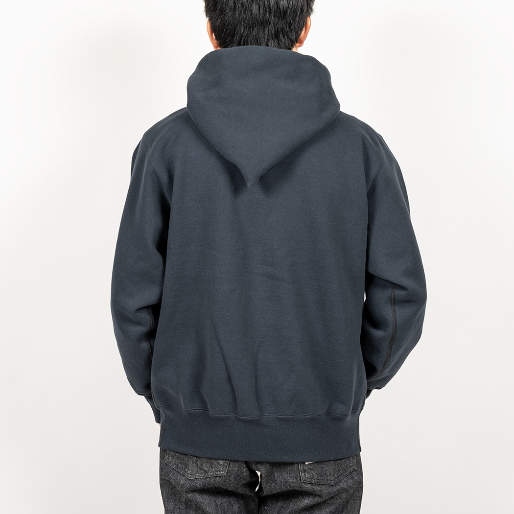 表30 番・中30 番・裏7 番で、裏の糸ループを短く編み、 さらに起毛をかけた本格的冬用スウェットです。ガチガチに目を詰めて編んでいるので形崩れしにくい。重さは15 オンス程あり、いわゆる「超ヘビーウェイトスウェット」
