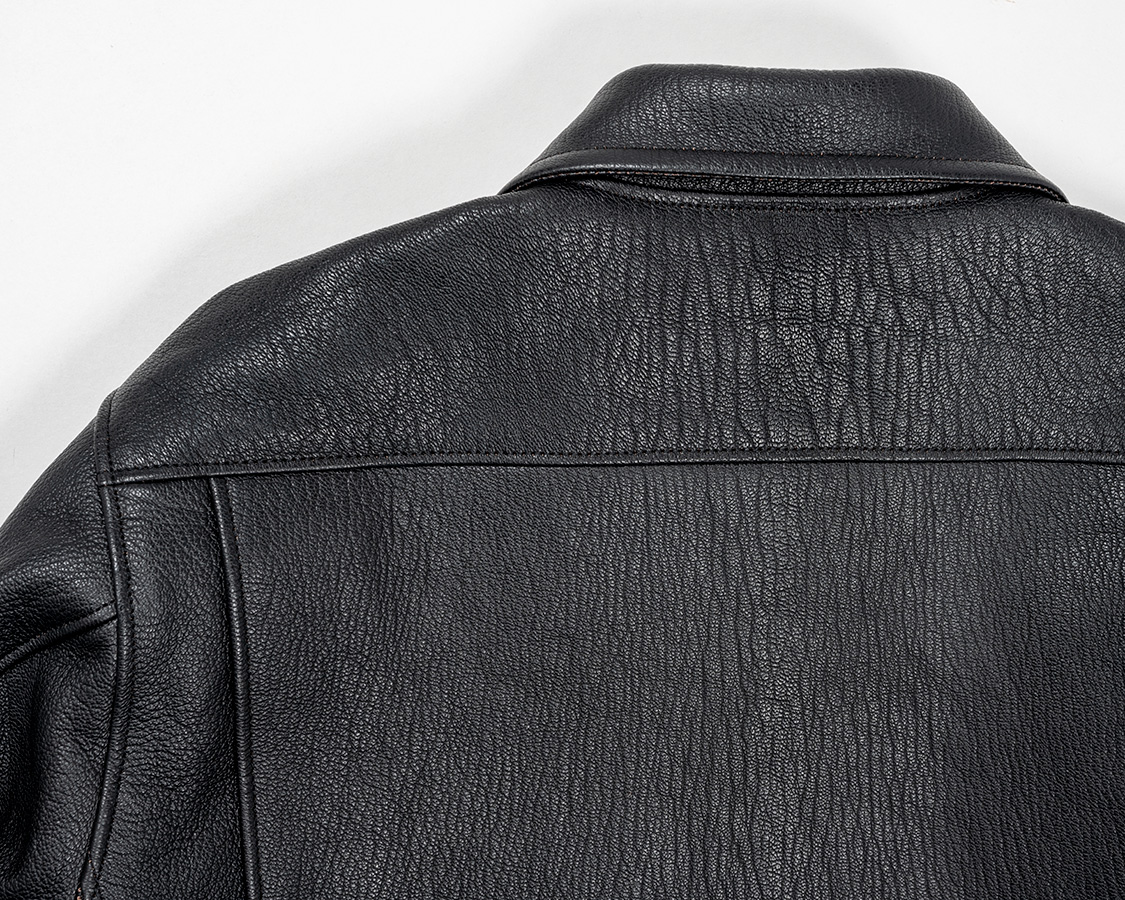 背ヨーク、アクションプリーツ入りの身頃。デザインでもあり、革の取り都合を良くする意味もあり、肩幅をある程度に抑えながら体が動いたときに背中が突っ張らないようにする機能性でもある。現代では素材自体、ストレッチが効いている物がほとんどですが、そういう機能が無かった時代、昔の人は良く考えたんだよなというデザイン。