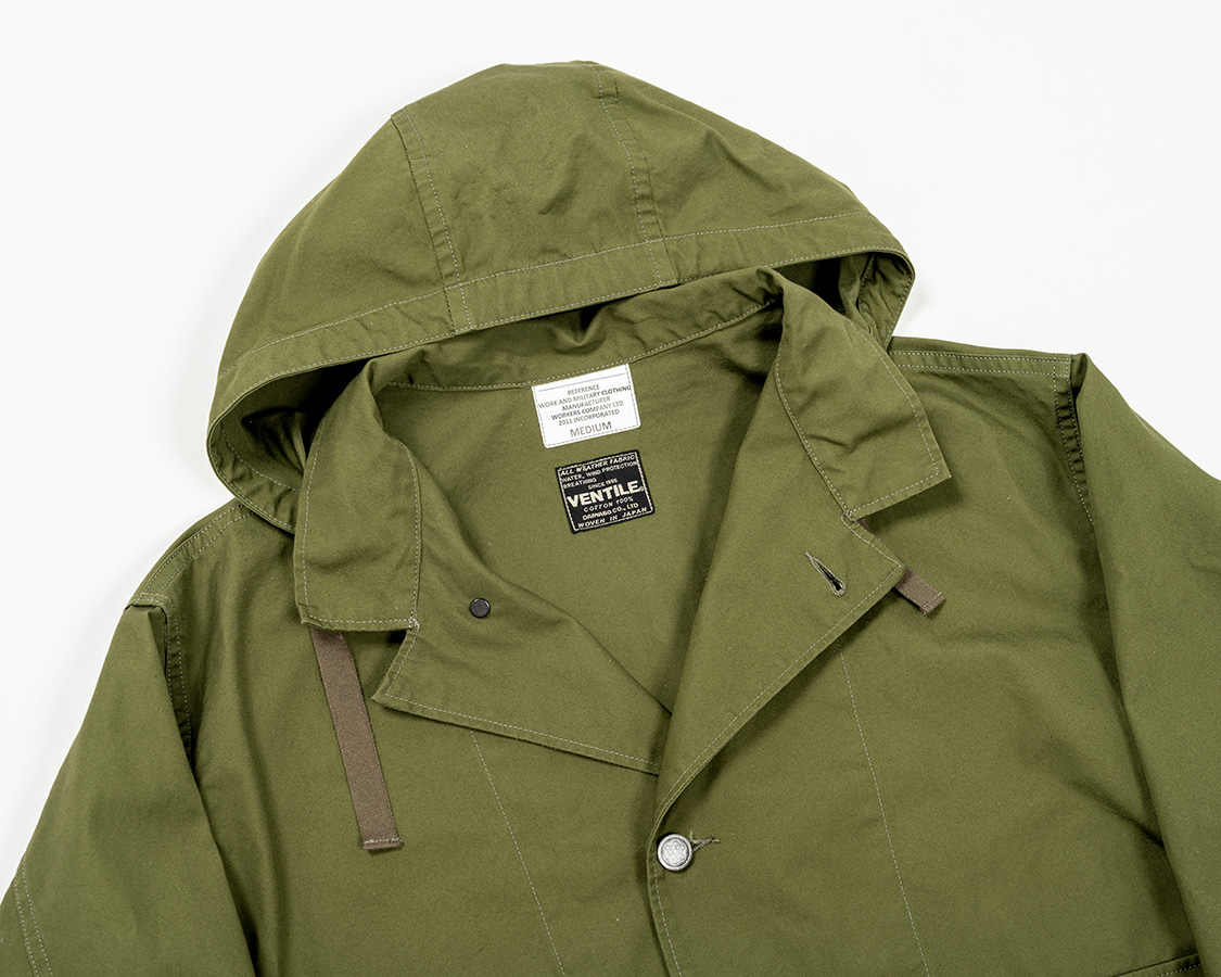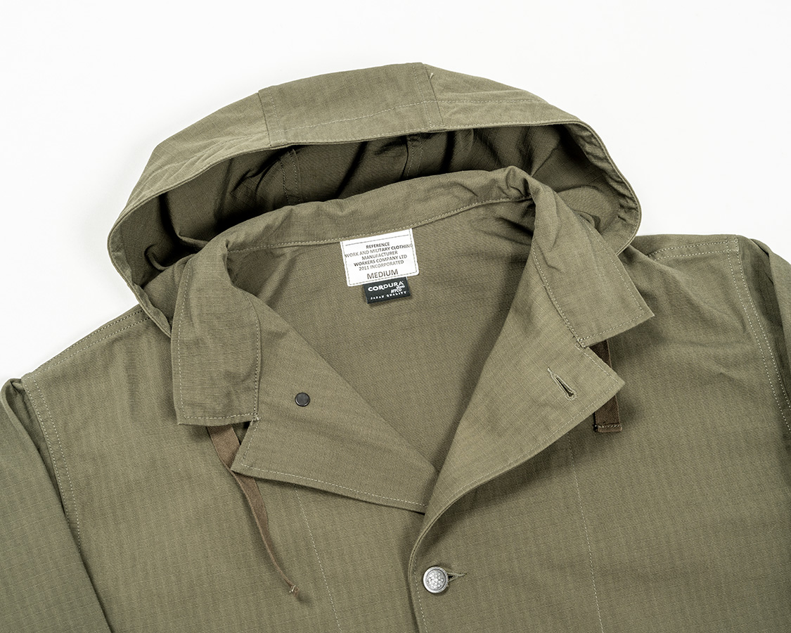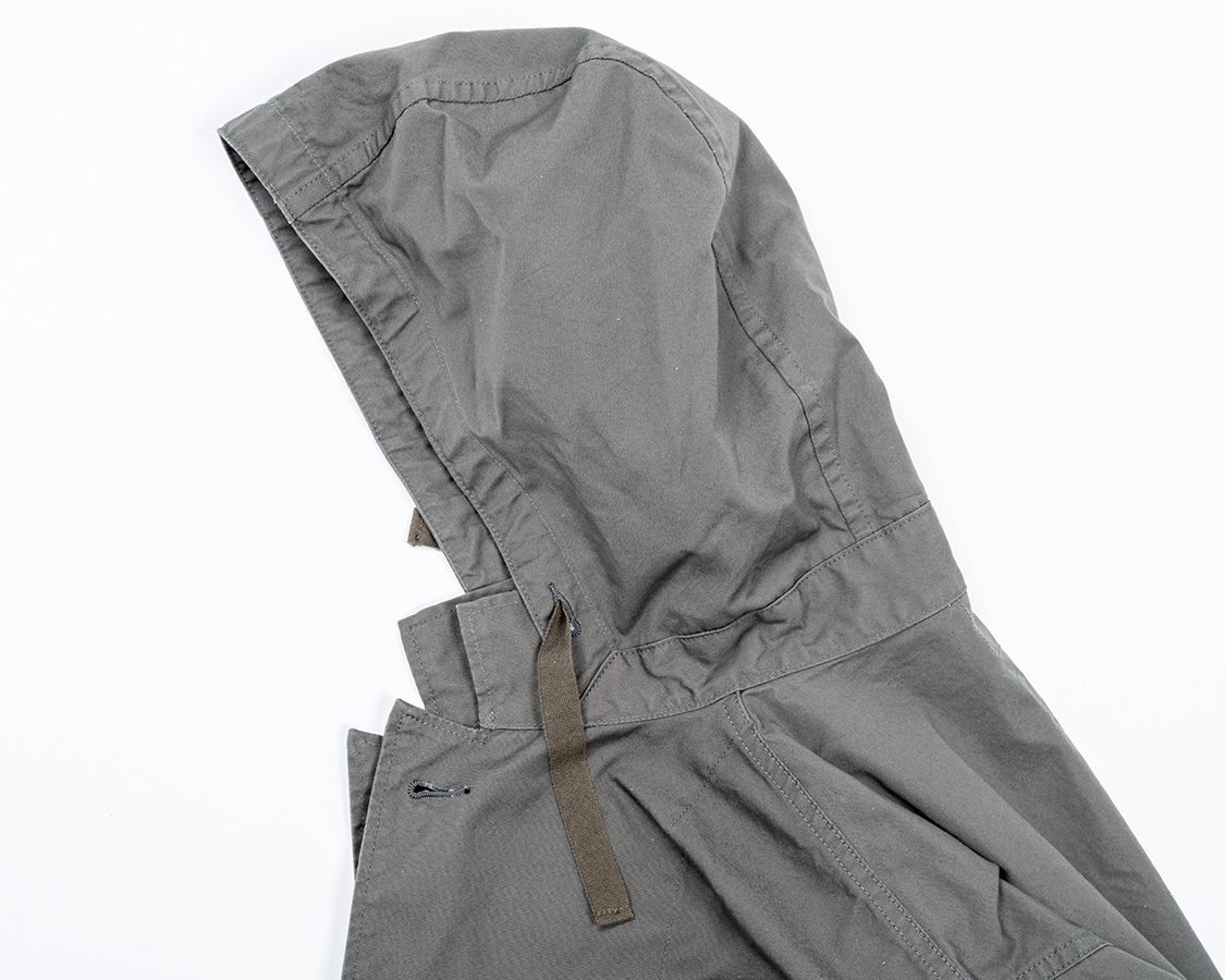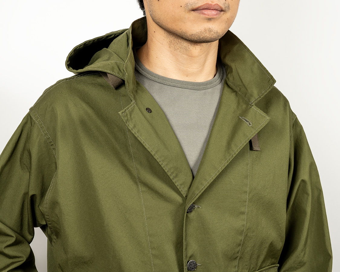 襟に切り替えがあり、そこにフードを挟み込んだ襟。もともと、アウトドアウェアで見かけた仕様をアレンジしたもの。