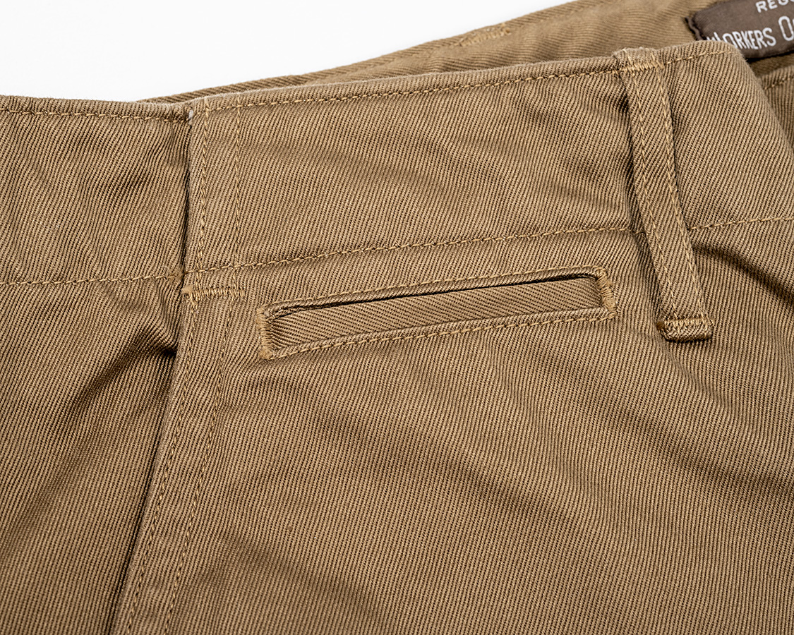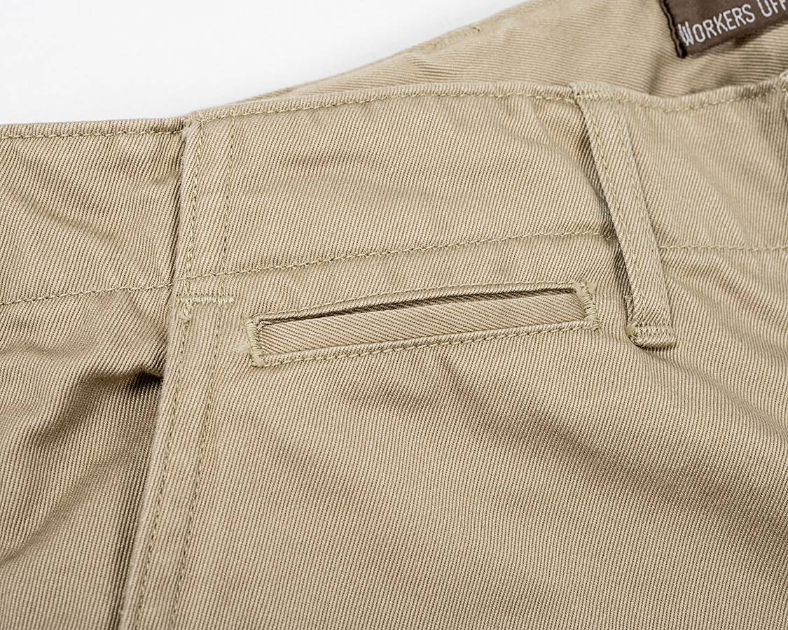 右前、コインポケット。正直、使い勝手は微妙。でもこれが無いとチノパン「らしく」無いのでつけています。個人的には、グレーディングの時にとっても邪魔で大変。小さくすれば収まりますが、小さすぎると意味が無くなる。結局、毎回、ループの位置の調整、ポケットを使える範囲内ギリギリで小さくしたり、工夫で何とかしています。