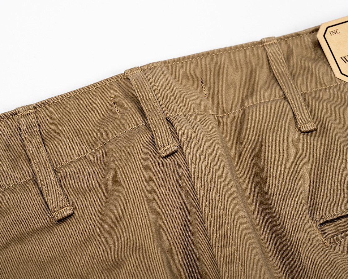現代ではカンヌキミシンもパワーがあるので、実は真ん中に載せることもできます。ビンテージでも厚地に特化していたのだろうなという工場で縫われただろうものは真ん中にループ乗ってることもあります。でも、非力なミシンだろうと、パワーのあるミシンだろうとチノパンを作らせて調達しなければいけない・・・となると、ループは「所定の数が、ほぼ所定の位置についていさえすれや良い」のでオフセットもOKだったわけです。それが今となってはデザインであり、「ビンテージのチノパンであるよね」という定番に仕様になっているわけです。