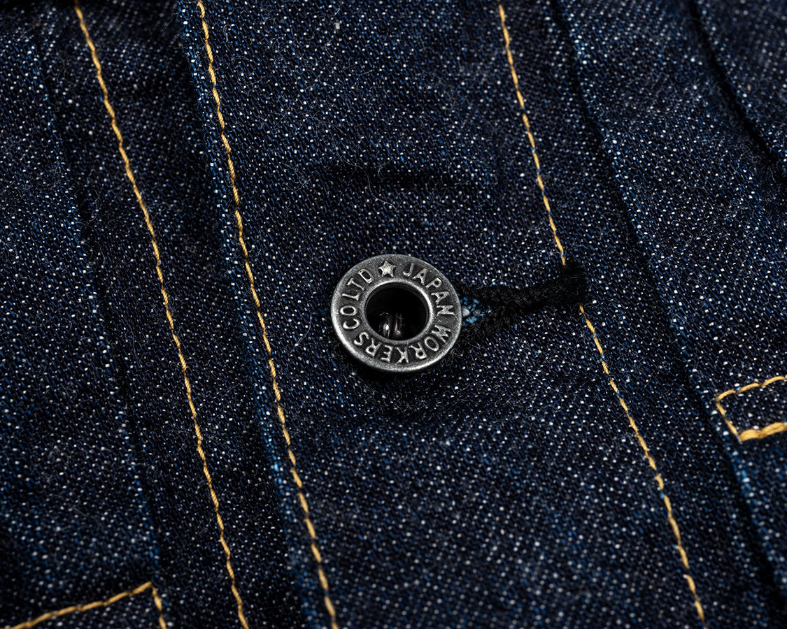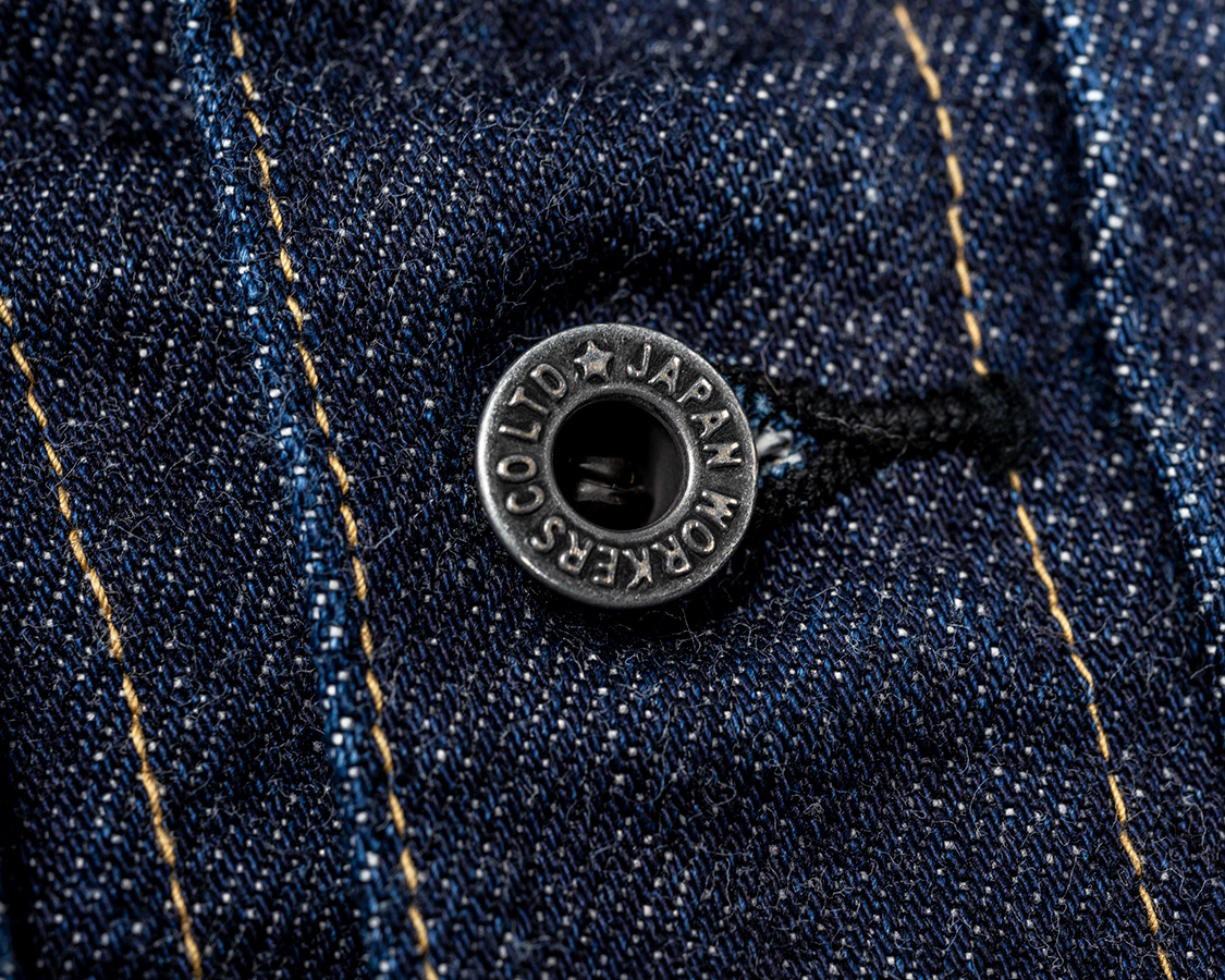 新しく作った小ぶりのWORKERS刻印入りドーナツボタン。古いデニムジャケットで見られる小ぶりボタンをデザインとして取り入れてみると・・・ブラック系のうっすら塗装でボタンがさらに小ぶりに見える。またなぜか、クラシックな雰囲気にも見える。