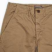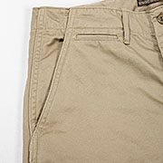 素材、チノは10 オンス程度の高密度生地。USMC Khaki はWORKERS 別注色。ビンテージのUSMC と思われるチノパンから取った、土臭い濃いめのカーキ。Light Beige はいわゆる「チノパン」のベージュ。