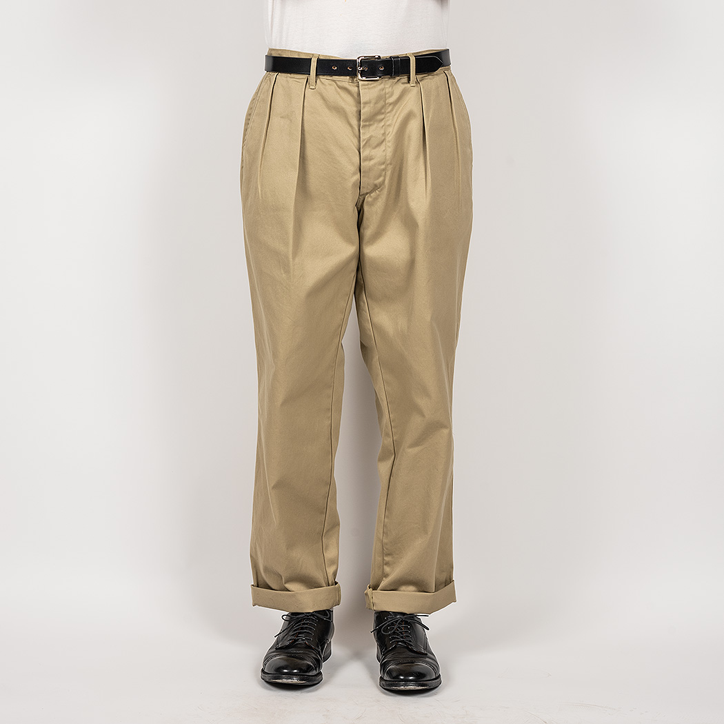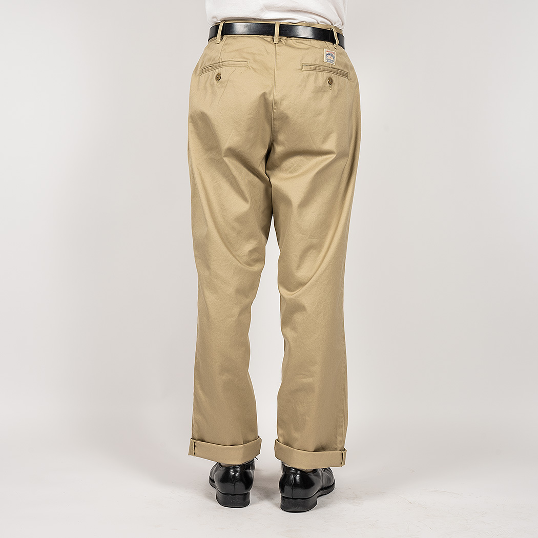 素材、チノは10 オンス程度の高密度生地。USMC Khaki はWORKERS 別注色。ビンテージのUSMC と思われるチノパンから取った、土臭い濃いめのカーキ。Light Beige はいわゆる「チノパン」のベージュ。 |