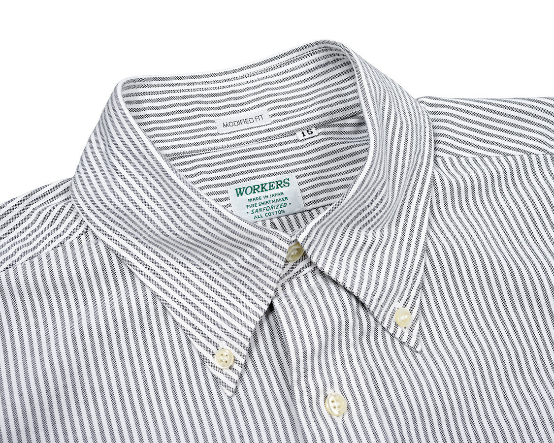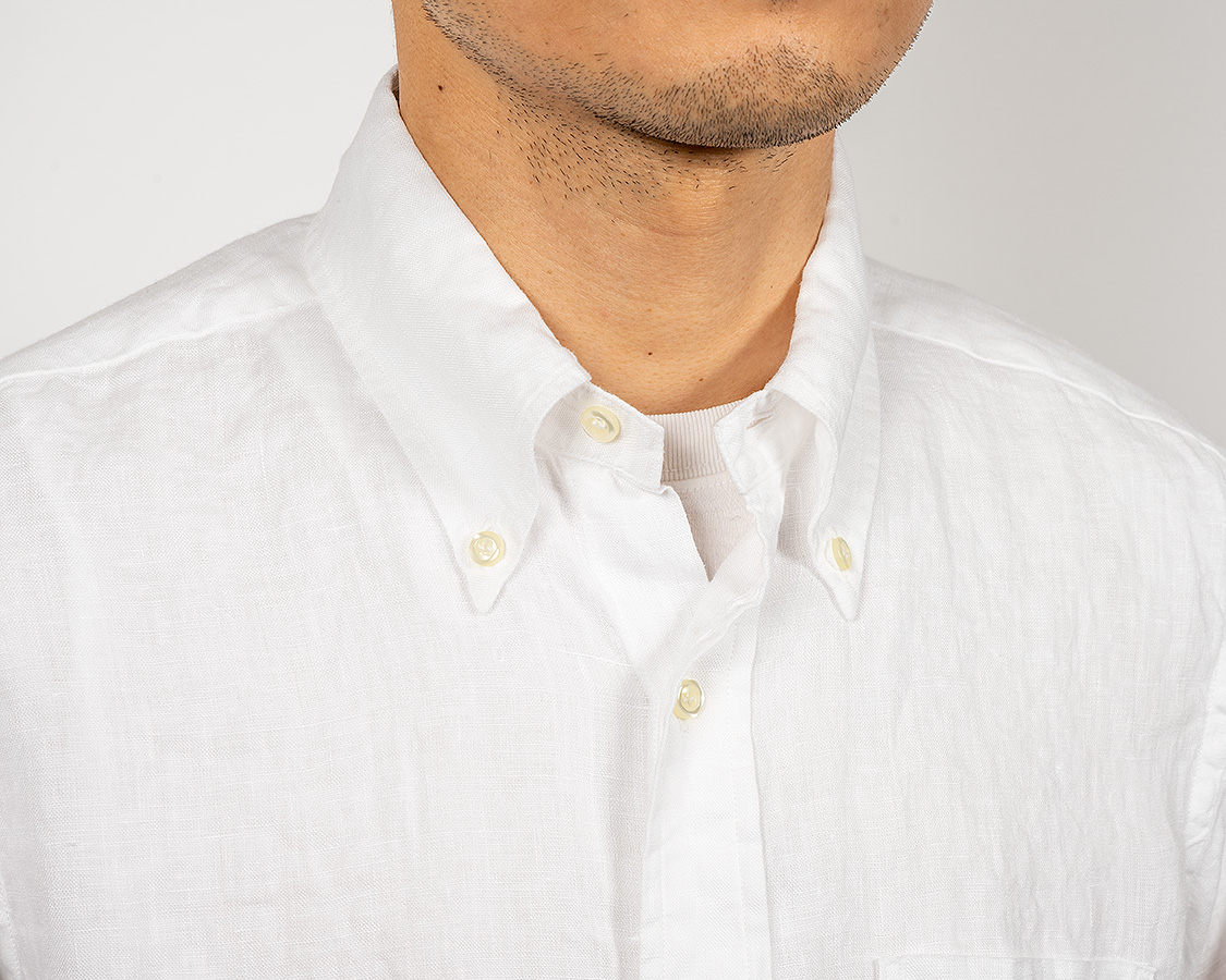 WORKERSでは台襟のボタンを開けて着た時に適度なロールができるよう位置を決めています。
