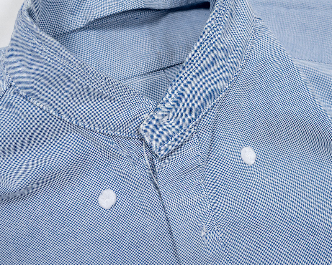 羽襟先のボタン。襟ステッチにかかるぐらいの位置。厚手のオックスでもきれいにひっくり返っている襟先。やっぱり、こういう部分は「シャツ専門工場」の仕上がりの良さがわかる部分です。私もよく「服縫えるの?」と聞かれますが、形にはできます。でも、中々きれいに出来ないのがこういう襟先とかひっくり返す部分。道具も要るし、一日にそこを何十枚をやるからこそ、量産の独特な「うまさ」が出る部分です。
