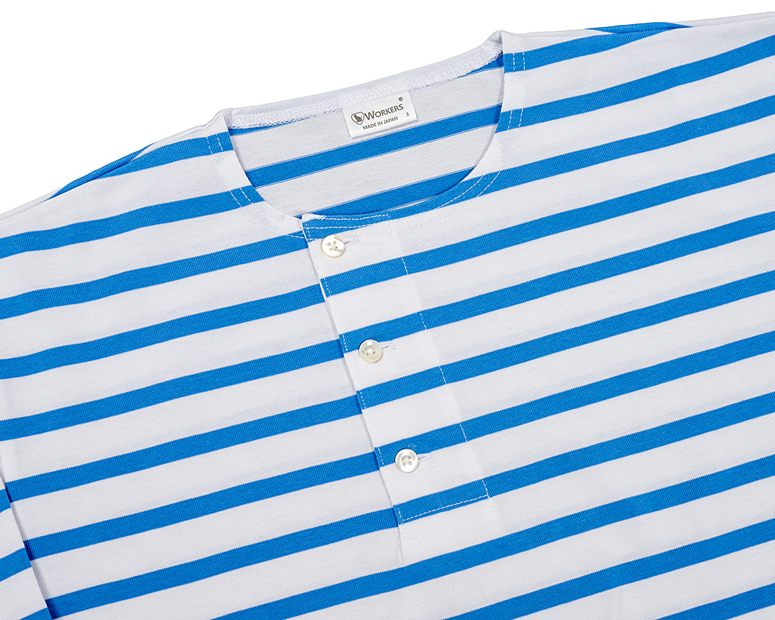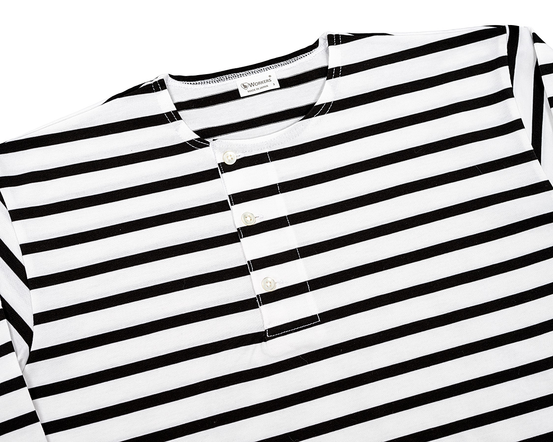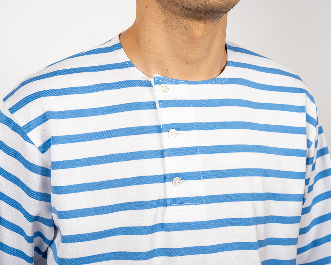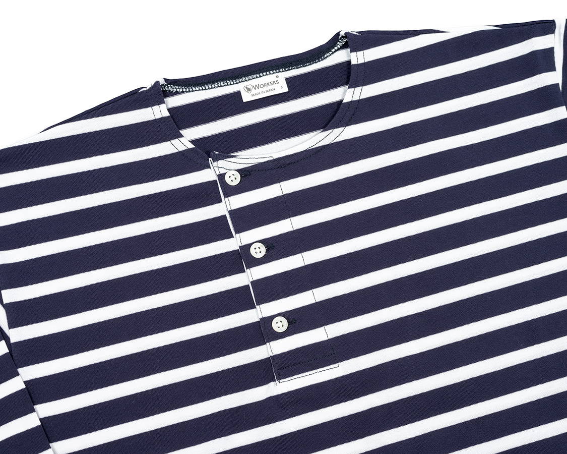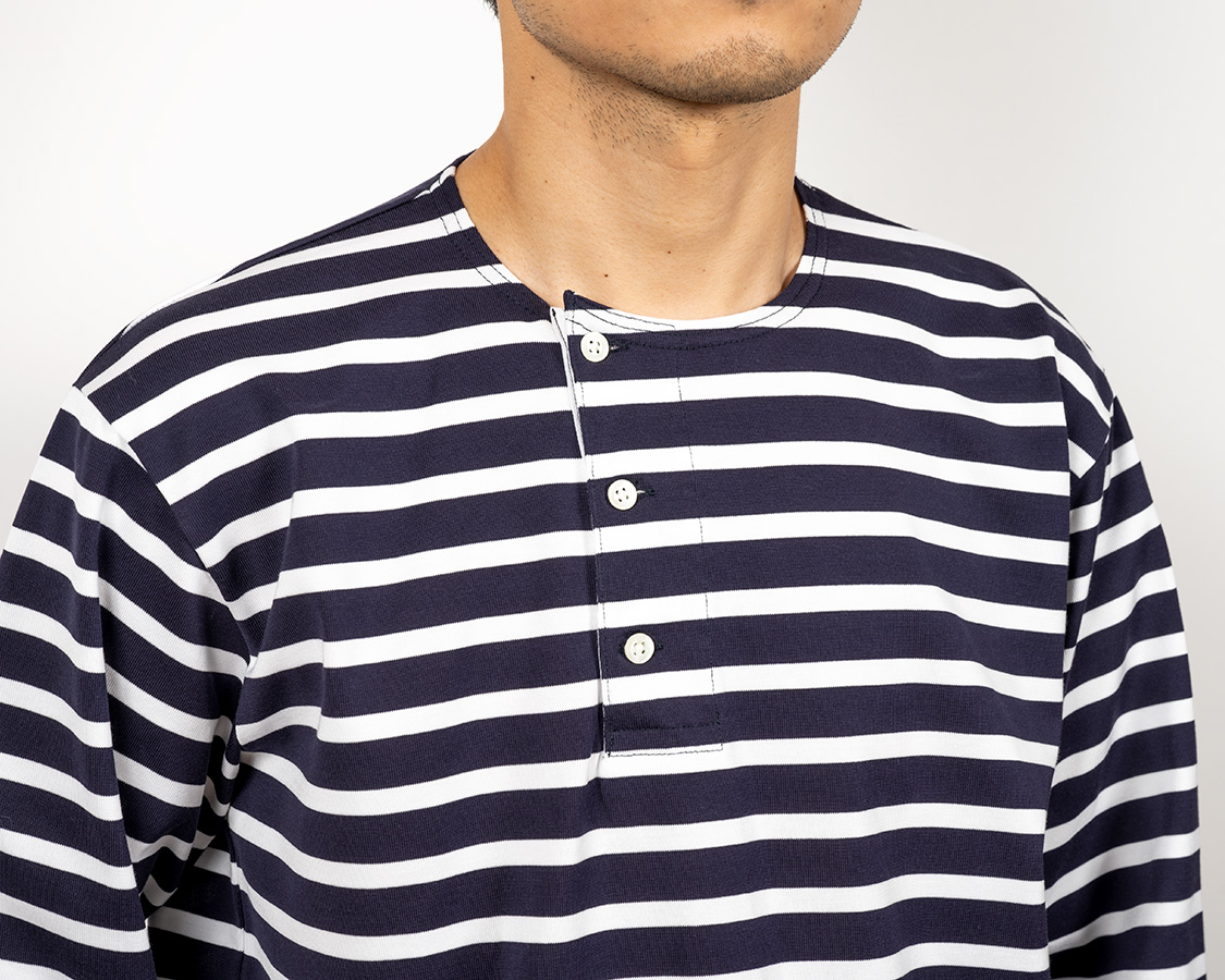 脇よりにオフセットされたヘンリーネック。もともと、おそらくアメリカ物のウール肌着から着想を得た仕様。