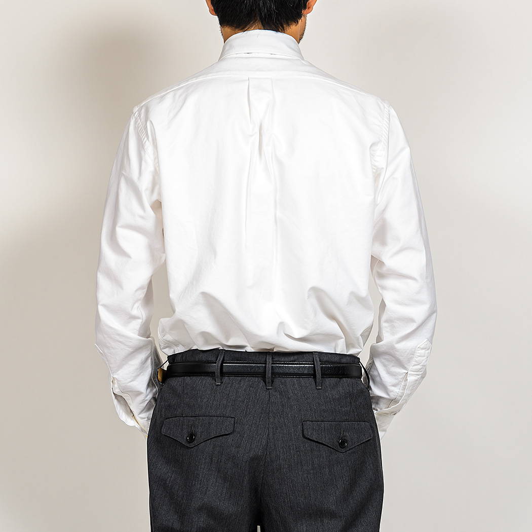 身頃、フィット感はあるがピタピタでは無い。肩幅も落ちすぎず、入りすぎず。着丈は裾を出しても・入れても着られる75センチ程がマスターサイズ。袖ぐりのカマ(縦方向の寸法)自体はある程度余裕があり、窮屈さは無い。でも肘から先をわずかに細くしてすっきりと。その分、袖がまくりづらくなるので、袖口の開きは深めにとる・・・といったように、機能性を考えて型紙をひいています。「デザイン的なシャツ」では無く、「設計的なシャツ」とでもいうのでしょうか。型紙を自分でひくからこそ、こういう作り方の品番もあるのです。