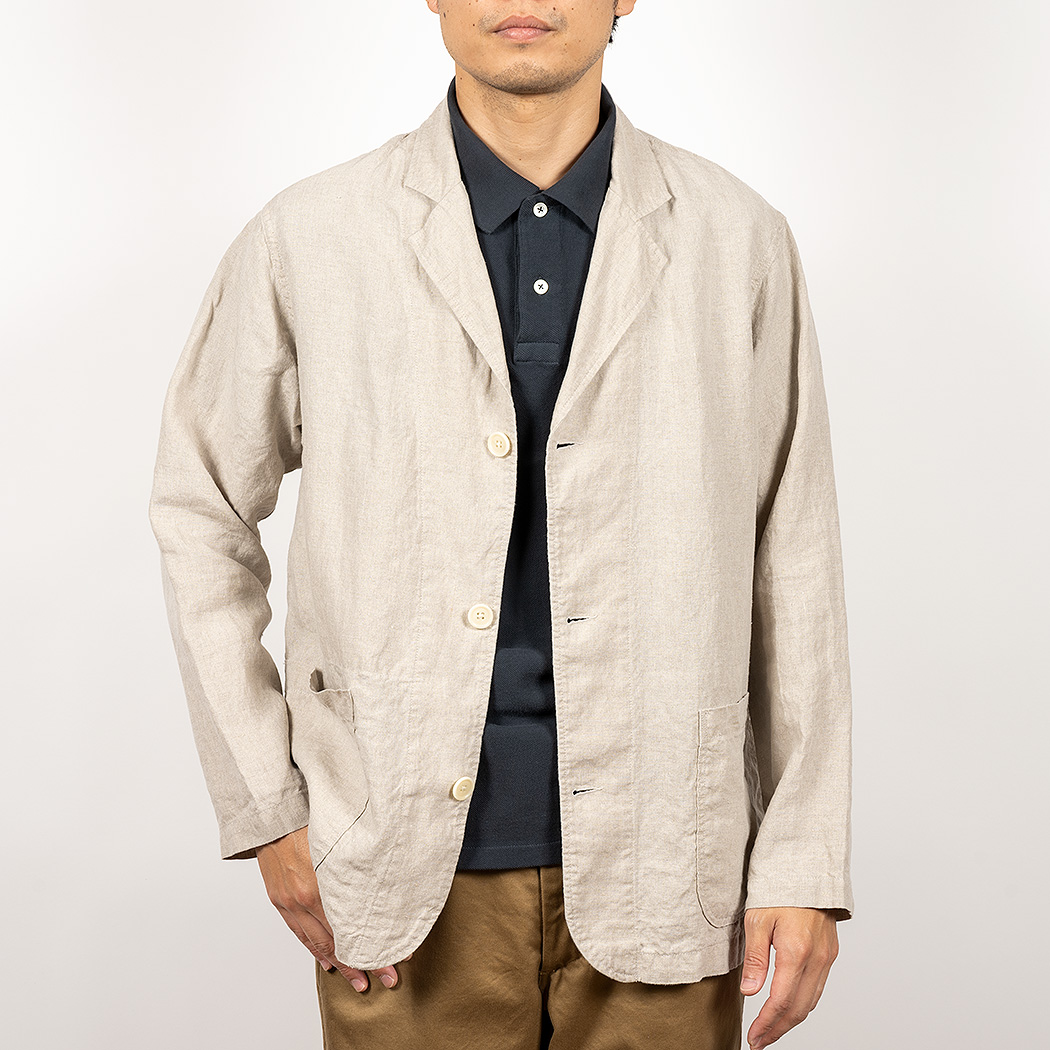 あくまで 「夏ジャケット」 なのでシルエットはゆったり。肩は落ち気味。袖も太く。ジャケットというよりはシャツに近いシルエット。