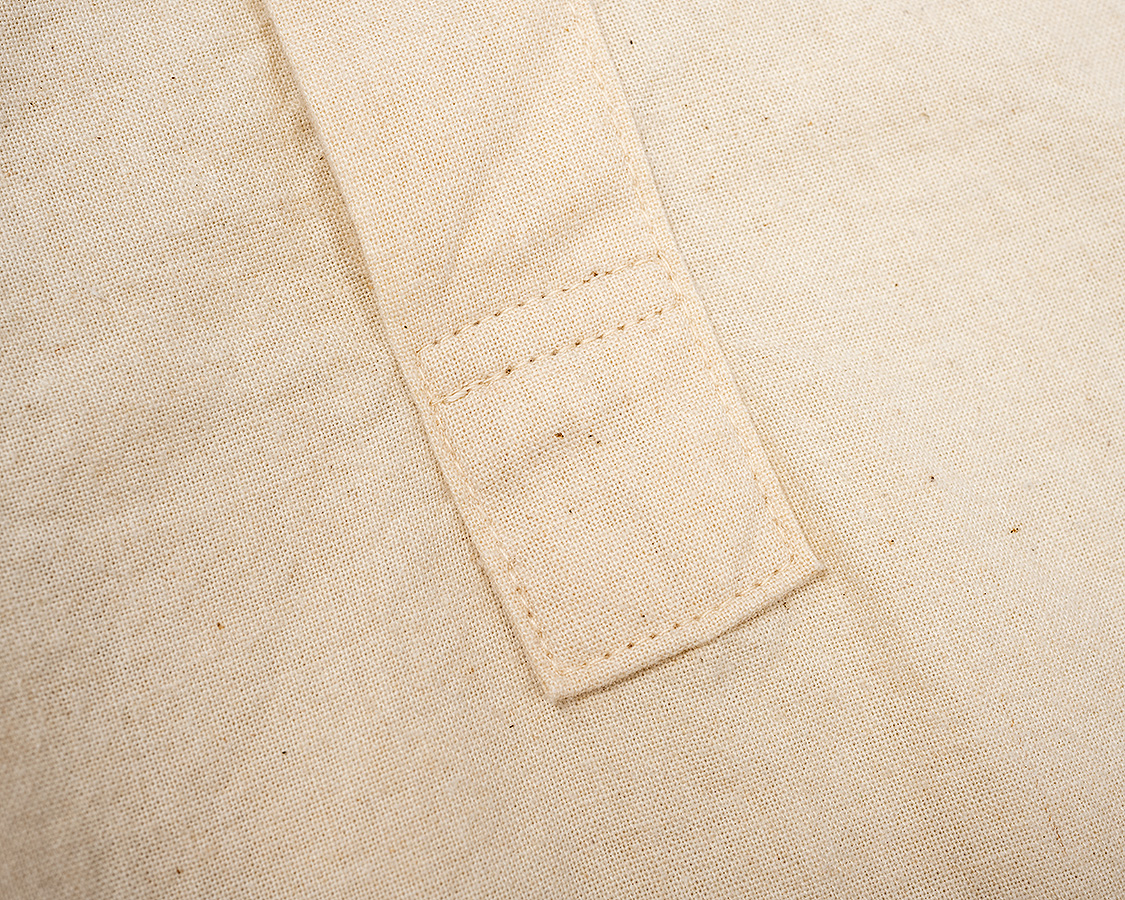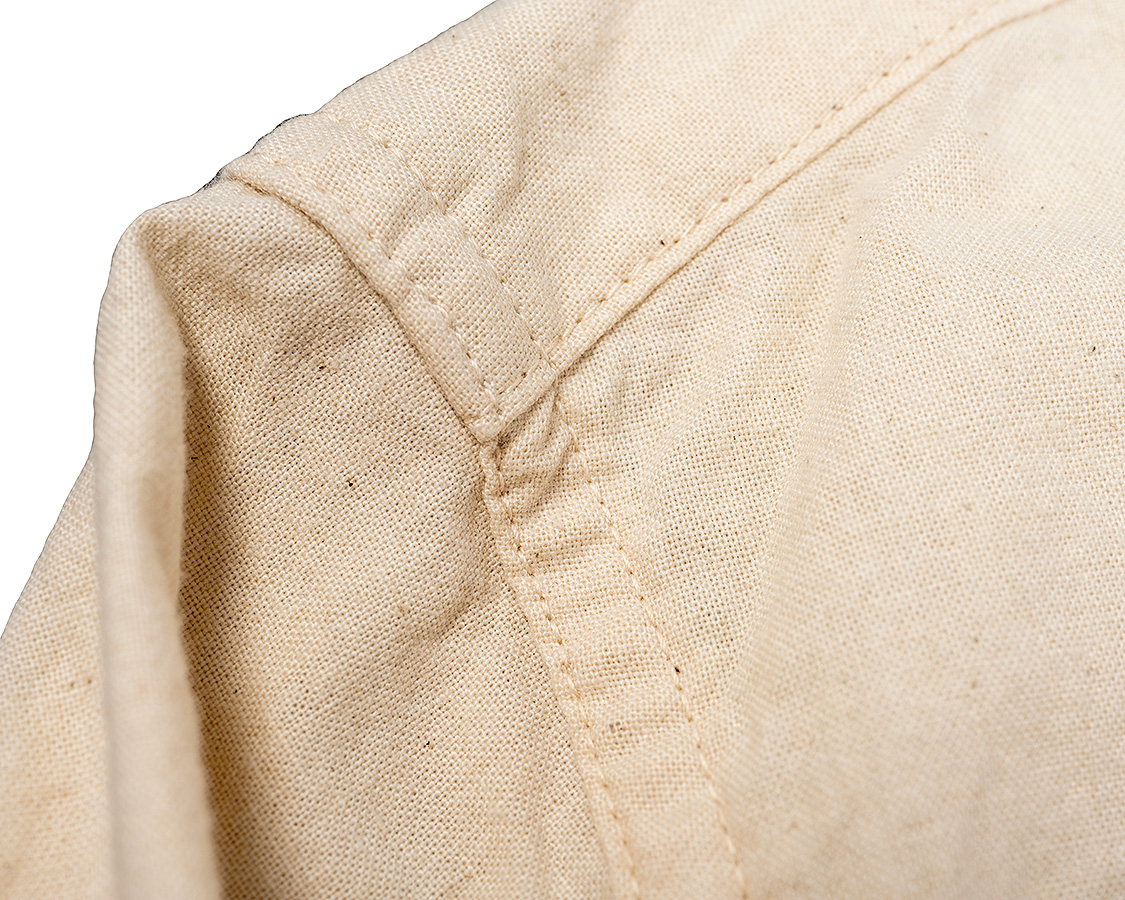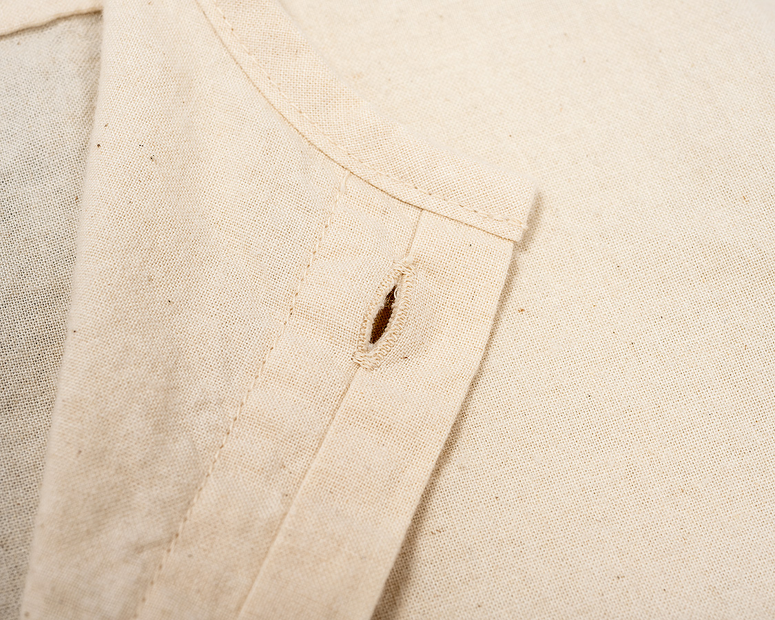 フロントの開き。袖口の剣ボロ開きと同じような仕様。平ミシン始末で、切り込みも深くは入っていないので強度OK。