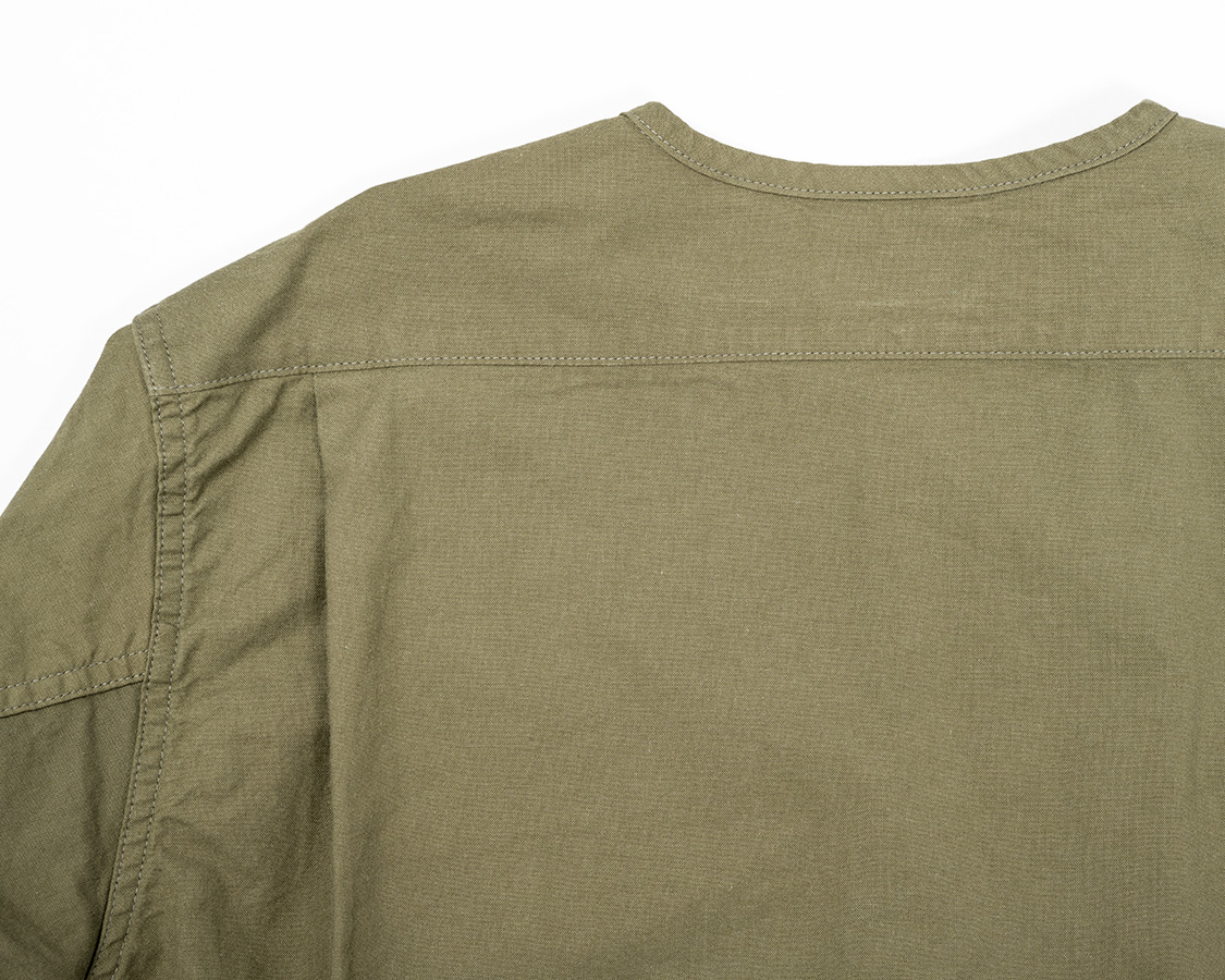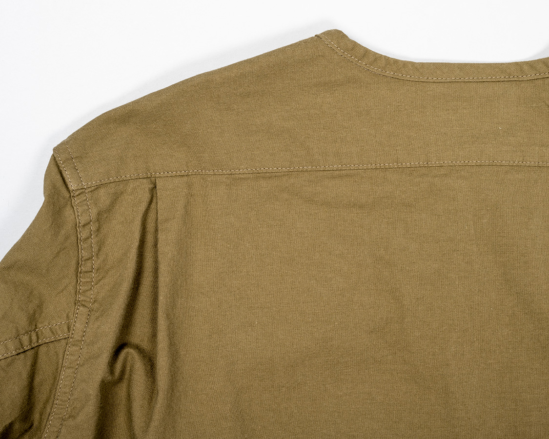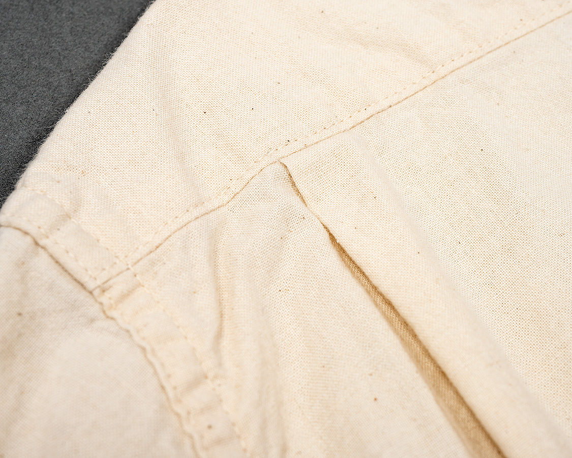 背面、ヨークをつけて身頃はタックを入れる。これで、肩幅はある程度収まりが良く、かつ身幅にゆとりが出て突っ張らない。