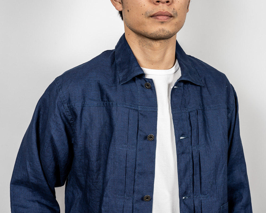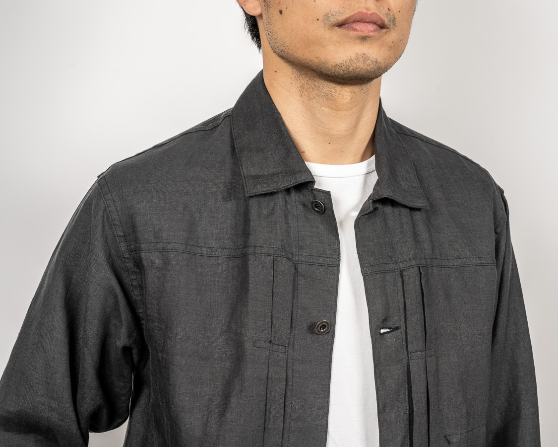 ボタンは金属。椰子などの天然素材も考えましたが、クラシックなワークウェア=金属ボタン というイメージで採用しました。刻印、塗装の雰囲気も製品の力強いデザイン、でもリネンの素材感に合っていると思います。また、糸付けのボタンで比較的軽いのもポイント。ここにタックボタンを打ち込んでしまうと重さに生地が耐えられず垂れ下がってしまうのです。