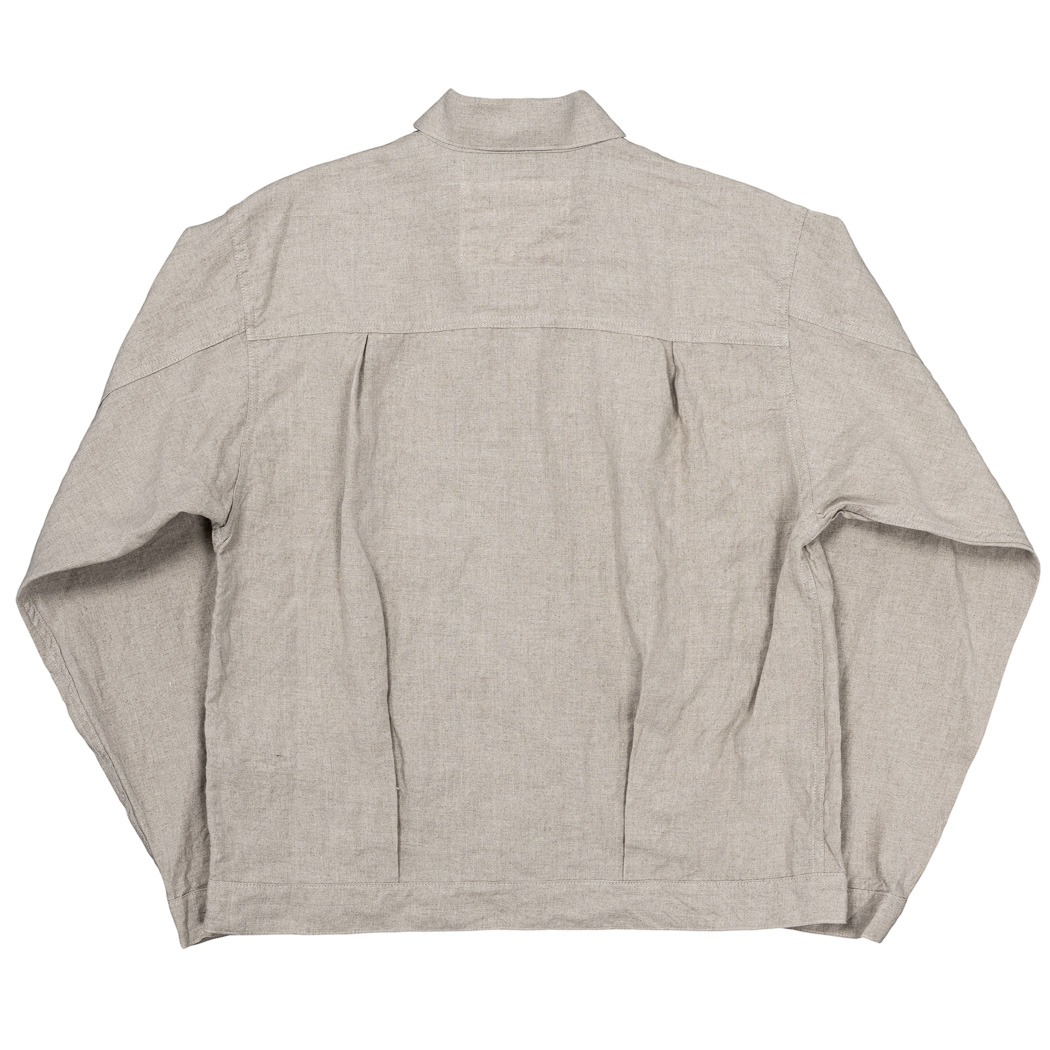 リネン、夏の定番素材。5オンス程でほぼチクチク無し。このなめらかな手触りは織った後の洗いや染めにあります。滋賀にある生地の加工屋さん、徹底的に何回も揉んで、洗って。自然な柔らかな風合いになるよう乾燥もベルトコンベアに生地を乗せてものすごく大きな乾燥機で「ふわっと」乾かす。揉んだり・洗ったり・乾かしたりも一度で求める風合いにならなければ、何回も工程を繰り返したり。その工程も「なんとなく」ではなく、きちっとデータ・仕様になってそれぞれの生地・色ごとに管理。だから、この風合いが安定して生み出せているわけです。