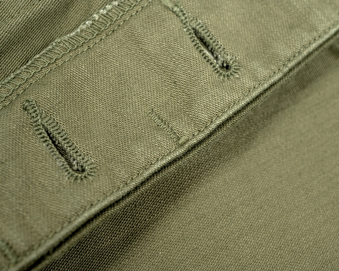 WORKERSの工夫、フロント上部の隠しステッチ。これは、ボタンホール内部の生地を落として厚みを抑えているので、その落ちた生地部分に指が当たらないようふさいでいるステッチ。これが表に出ないように入れるのがポイント。