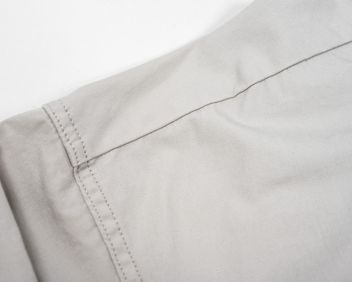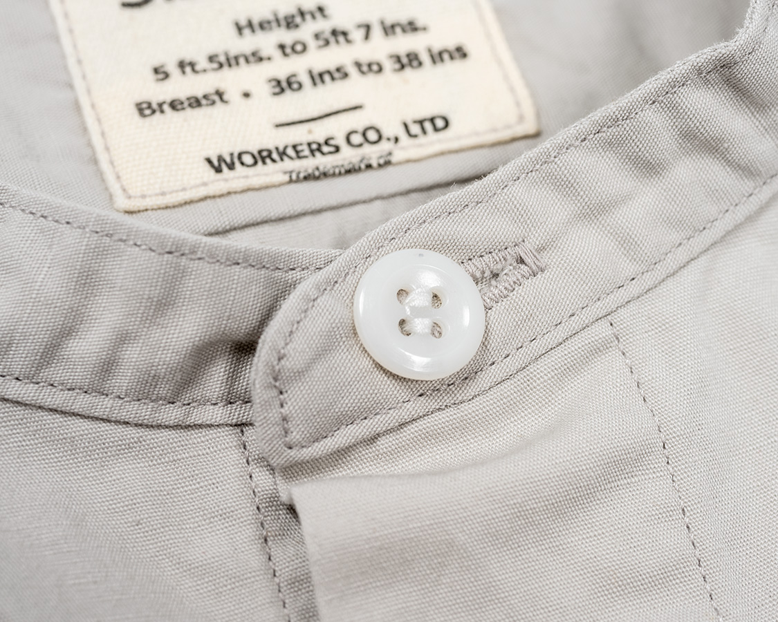 細めのバンドカラー。表は一本ステッチ、裏は芯止めのステッチがもう一本入ります。