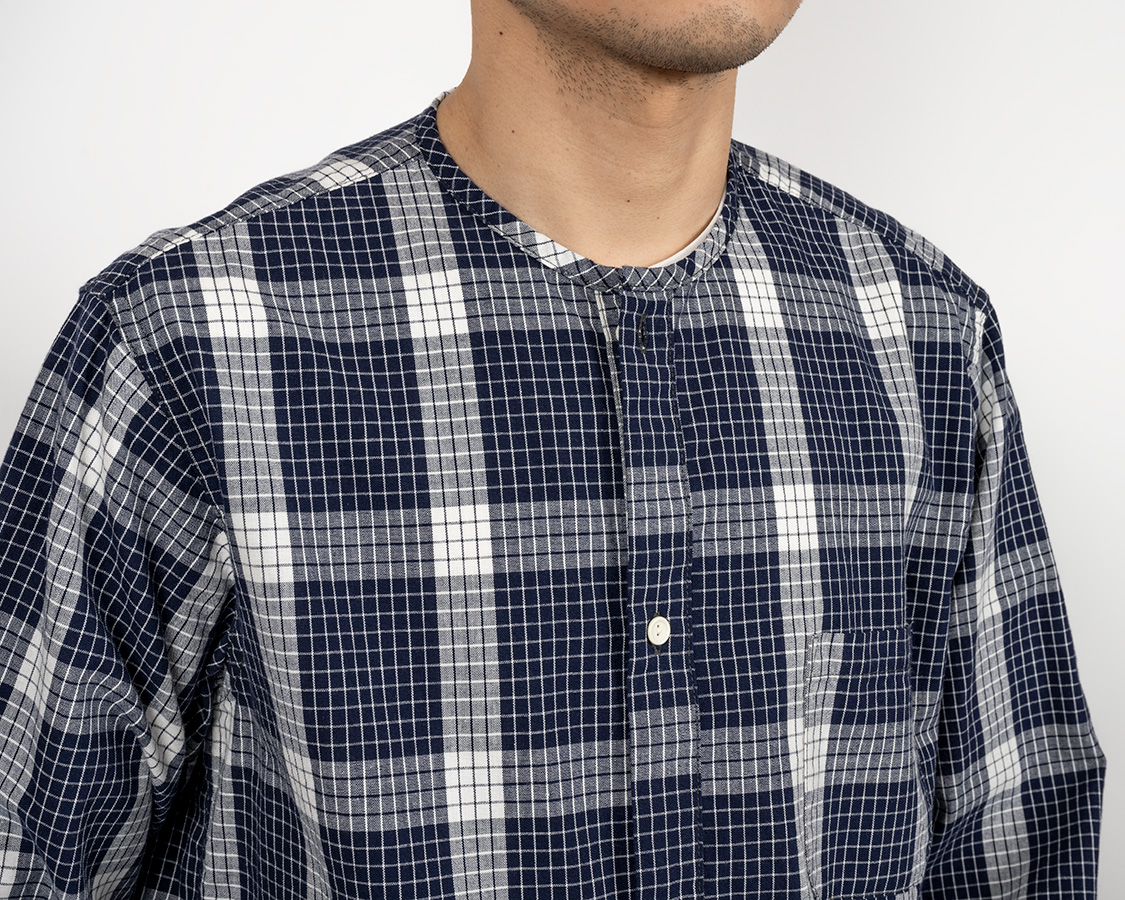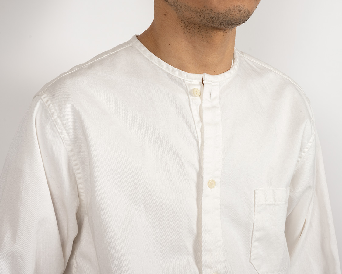 ミリタリー風のネーム。首回りは細めのパイピング。ここがバンドカラーと違うところ。バンドカラーは細いながらも襟がついているが、Sleeping Shirtは身頃の首回りを身頃と同じ生地でくるんでいる。