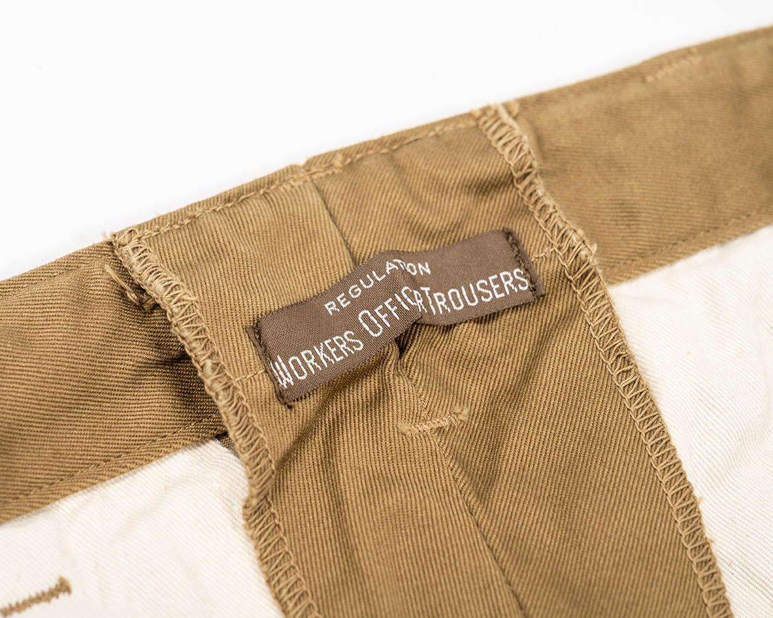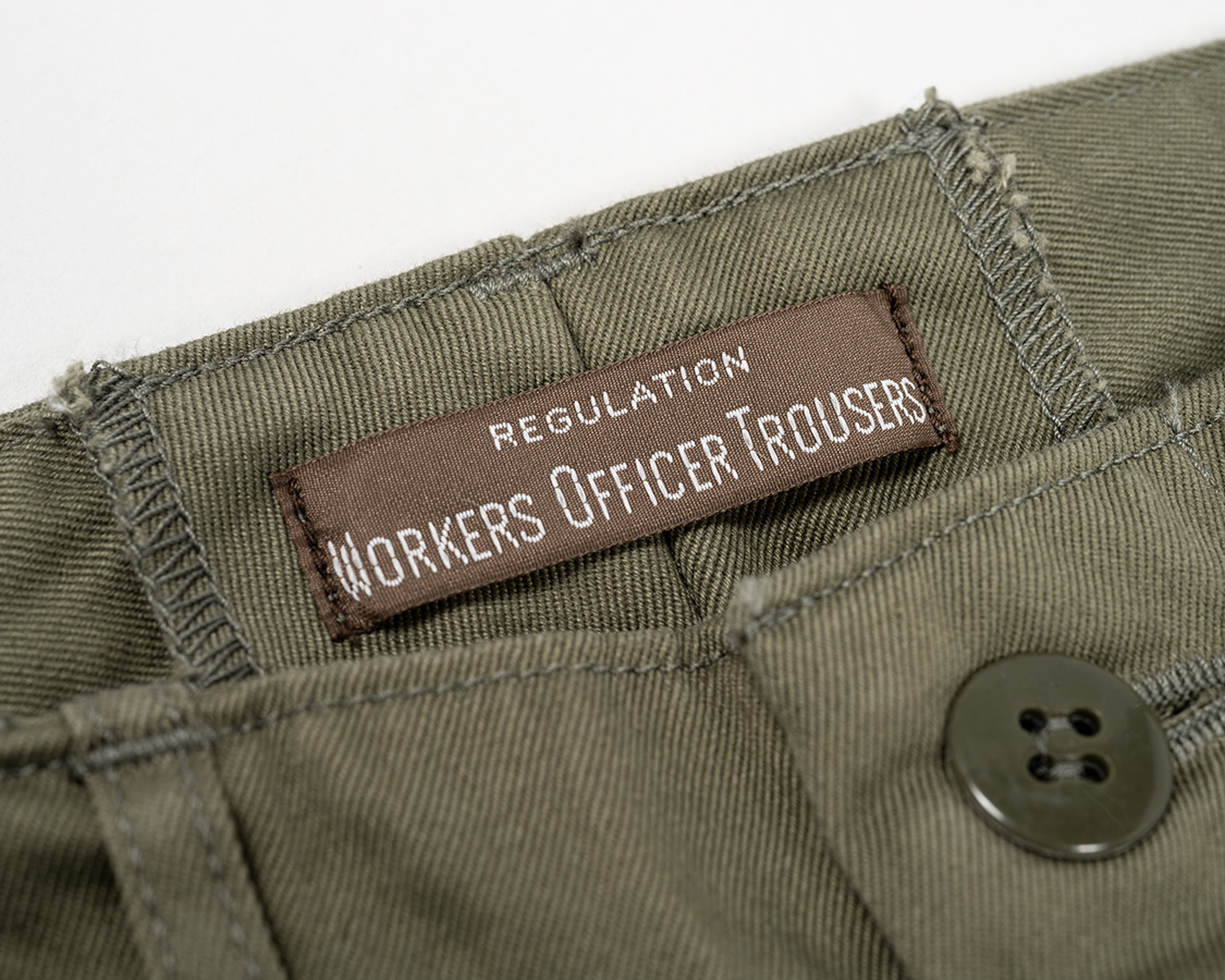 後ろ中心にOfficer Trousersネーム。尻ぐりは割り縫い。お直し屋さんでサイズ調節がやりやすいように。尻ぐりは二度縫いしていますが、どうしても無理に力をかけると裂けます。特に、屈伸のような動き、車に乗り込む時に股を開いたときなど等・・・裂けてしまった時は、その部分を少し手縫いで良いので縫ってください。