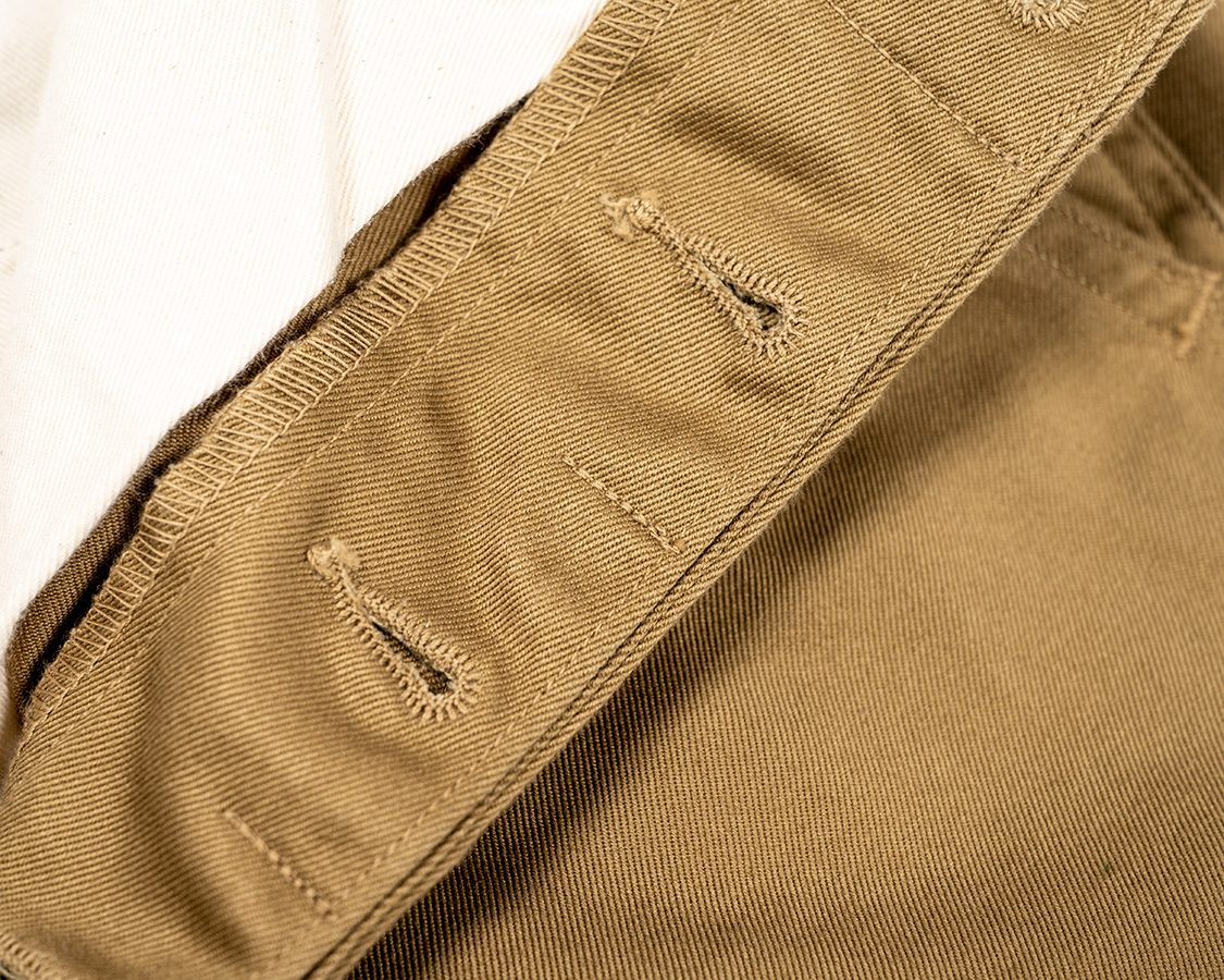 ボタンホールの間、見返しを比翼を止めるステッチ。表には貫通しません。クラシックなトラウザーズの仕様。