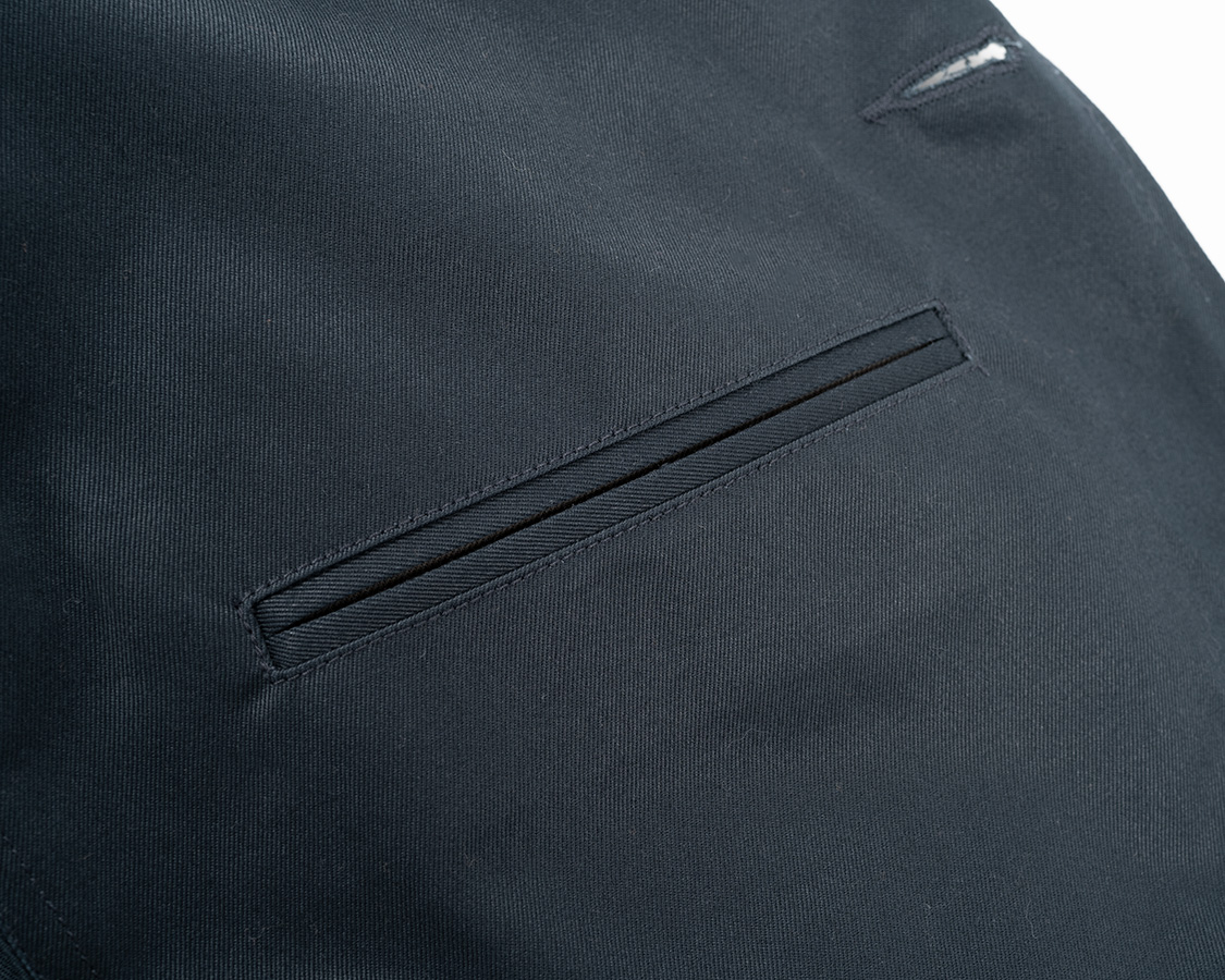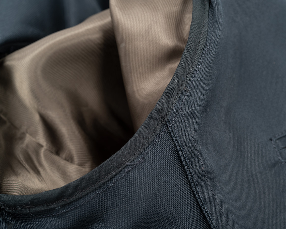 あえて一度止めている前端ステッチ。ここから上はラペル側表目、ここから下は身頃側表目。着た時にどちらもステッチの表目が出るように。