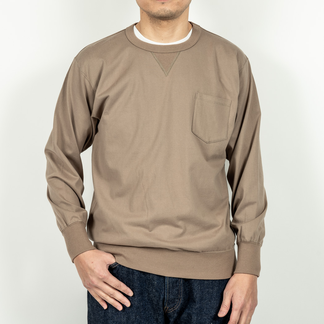 3 PLY Sweat Shirt、仕様はスウェットそのもの。前 V たたきつけ、袖口・裾はリブできゅっと絞る。首回り、リブ太め バインダー始末。首回りをリブでパイピング状に縫うので厚みが出て伸びにくい始末。