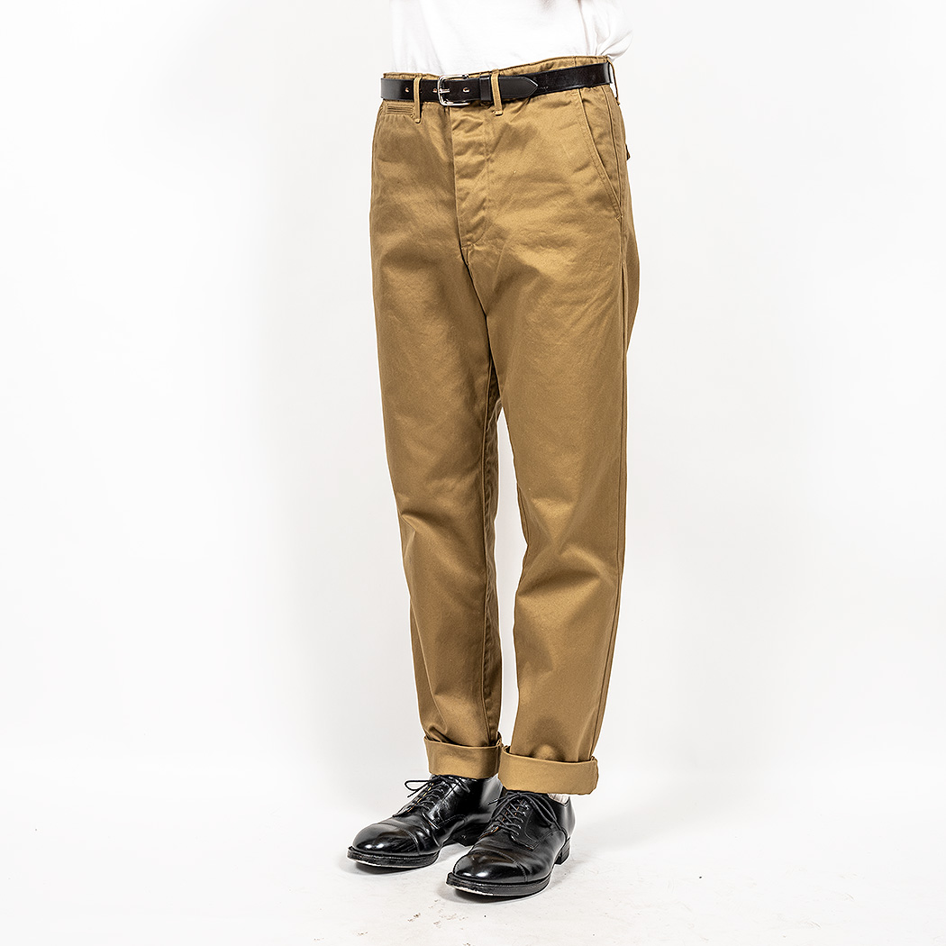 素材は10オンスクラスの高密度チノ。USMC Khaki色はWORKERS別注品。通常の白っぽいベージュではなく、もっと濃い黄土色。USMCと思しきチノパン から色を取ってます。