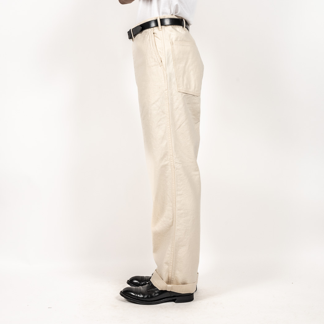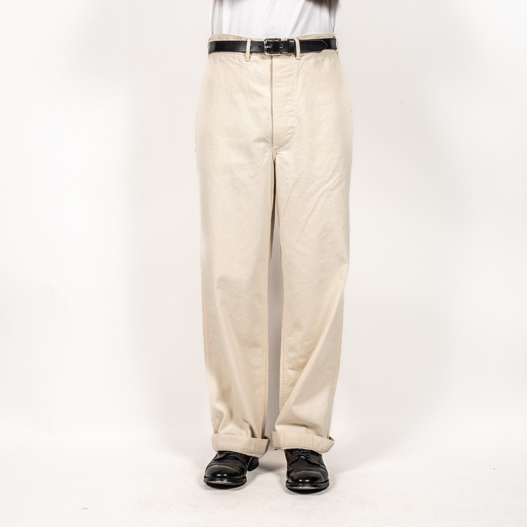 素材、 アレンジで生成りデニム。真っ白ではなく、生成り。そのため、生地表面には綿の葉カスが少し残っています。穿きこみ、汚れて、洗う。繰り返すと徐々に生成りが白っぽくなっていきます。