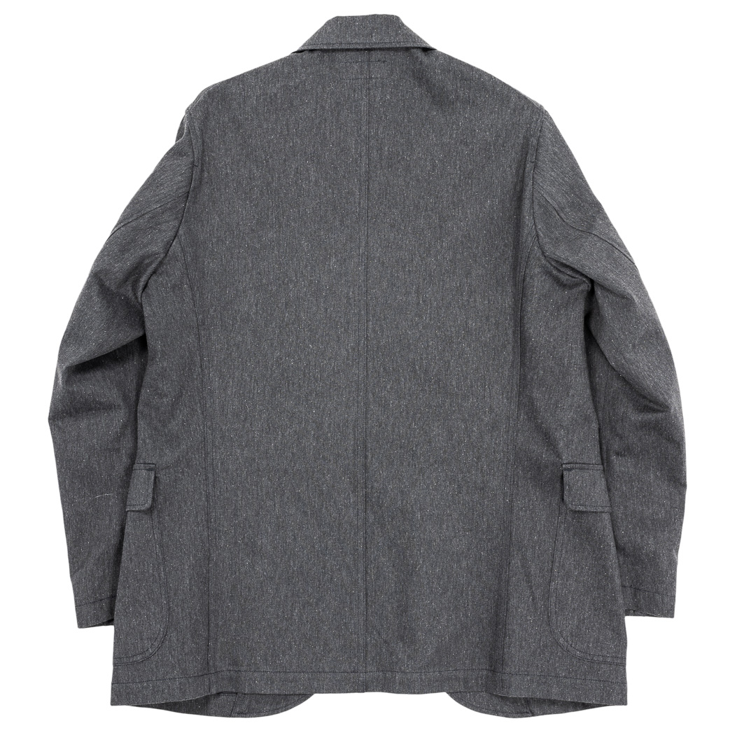 形は三つボタンの上二つがけ。3パッチで腰だけフラップ有り。大見返しに左右玉縁ポケット。袖ぐりはパイピング。