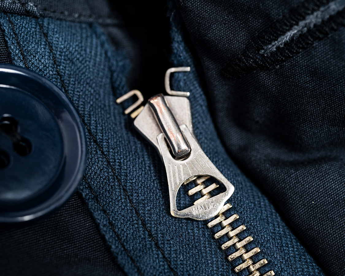 ファスナーはWALDESのオートマチック。元ネタ的には右差し・ヨーロッパ風のデザインを使いたいところですが、ファスナーの強度・上げ下げのスムースさがこれが一番良いと思うので、この形に。 |