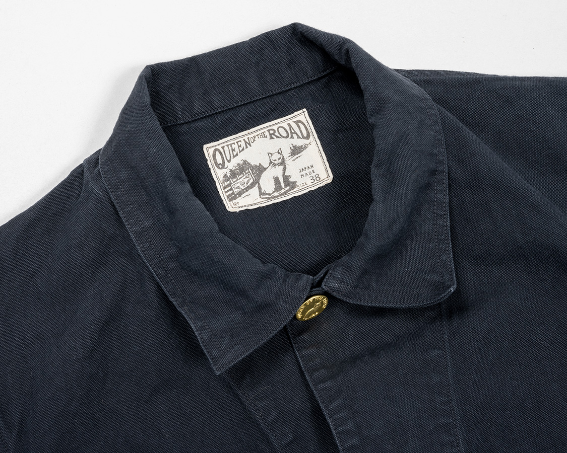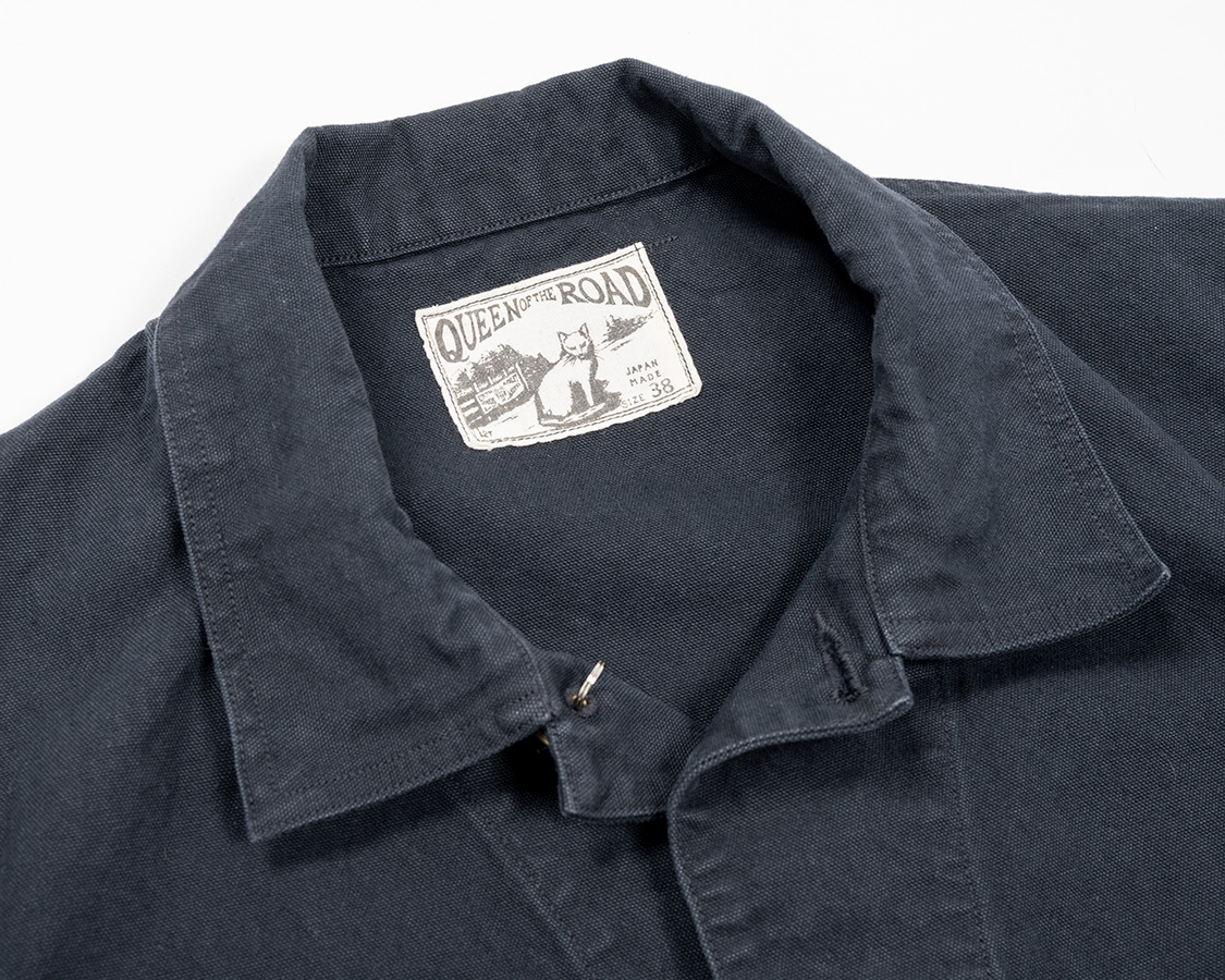Railroad Jacket、Chore Jacket、日本では「カバーオール」が通っているので、今回はカバーオールとあえて言います。カバーオール、以前作ったSuper Big Cat Jacketがトリプルステッチ+台襟あり。袖口もガントレットカフスと、これでもか!とワークウェアらしい仕様に対し、Queen of the roadは、一枚襟、ダブルステッチ、袖口もごく普通の見返しします。ある意味「地味」なのですが、そこが着る人・機会を選ばない理由。