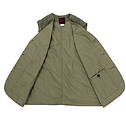 腰の二室ポケット、フロントの三日月型ポケット、内ポケットも左右に二つポケッ ト。フロント・バック共に裏地付。本来、ハンティングで獲物を入れたり、道具を入れて両手をあけるための「道具服」で、 WORKERS 版も「着るバッグ」といった雰囲気。