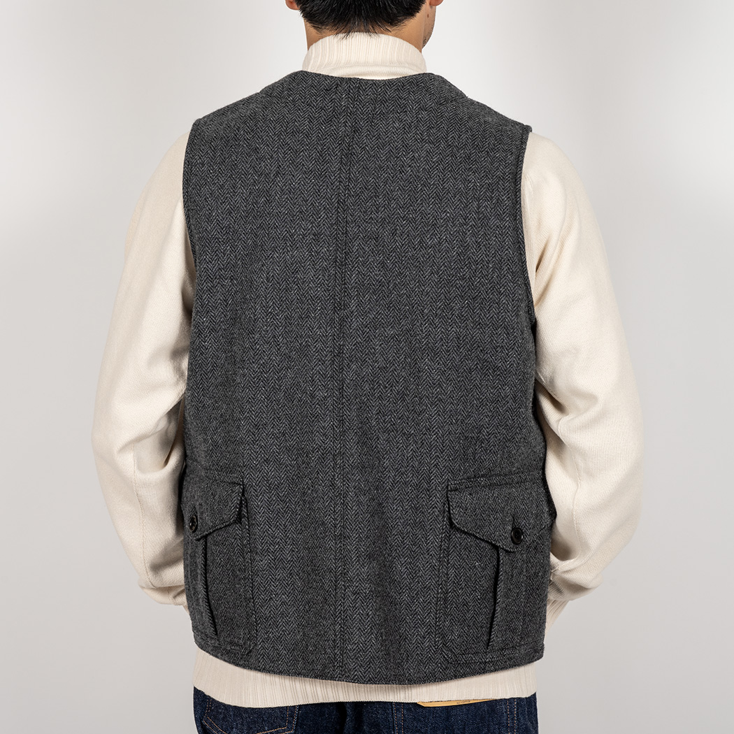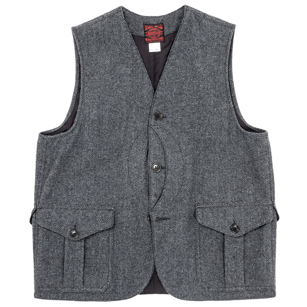 腰の二室ポケット、フロントの三日月型ポケット、内ポケットも左右に二つポケッ ト。フロント・バック共に裏地付。本来、ハンティングで獲物を入れたり、道具を入れて両手をあけるための「道具服」で、 WORKERS 版も「着るバッグ」といった雰囲気。