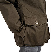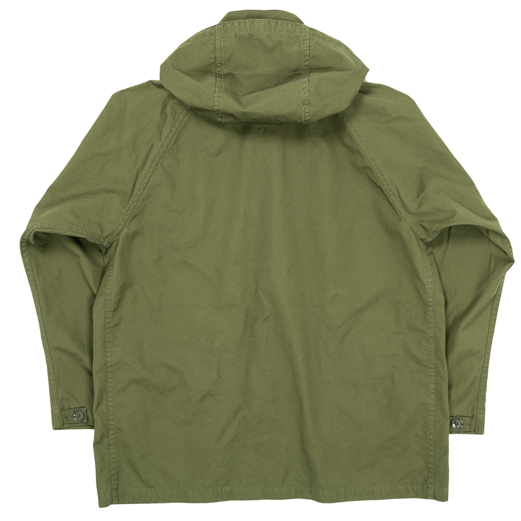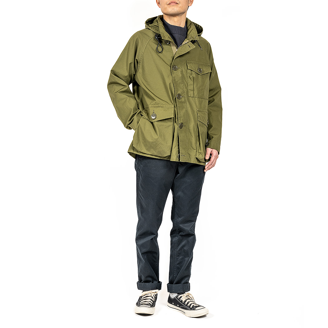 身頃をゆったり、アームホールもゆとりを取ったので中にシャツ+ 中厚セーターまでならOK。ジャケットを着るには裏 地も無いのでちょっときついかな?もっと、Fishtail Parka ぐらい思い切りゆとりを取れば一重のアウターにもなるのですが、そうすると逆に普段、シャツの上に羽織るにはゆったり過ぎる。RAF Parka は秋口や春先に羽織れるシルエットにしたいのでゆとりをつけすぎない、適度なフィット感に調整しています。