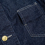 素材、いずれも10 オンス程。今回は防縮の入った生地ですが、現代のガッチガチな防縮では無いので製品でOW、縮切った状態にしています。初めて作ったBlack Duck、硫化染めでデコボコ部分に陰影が出て立体的な良い雰囲気。 |