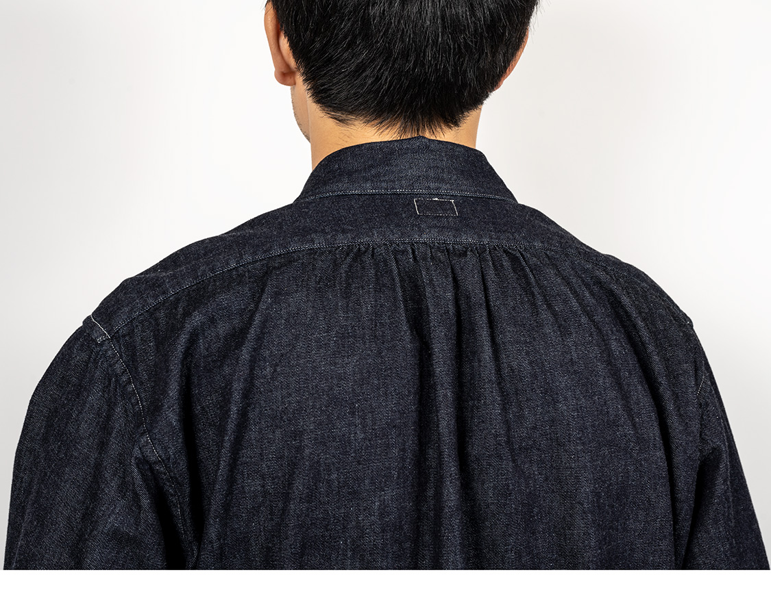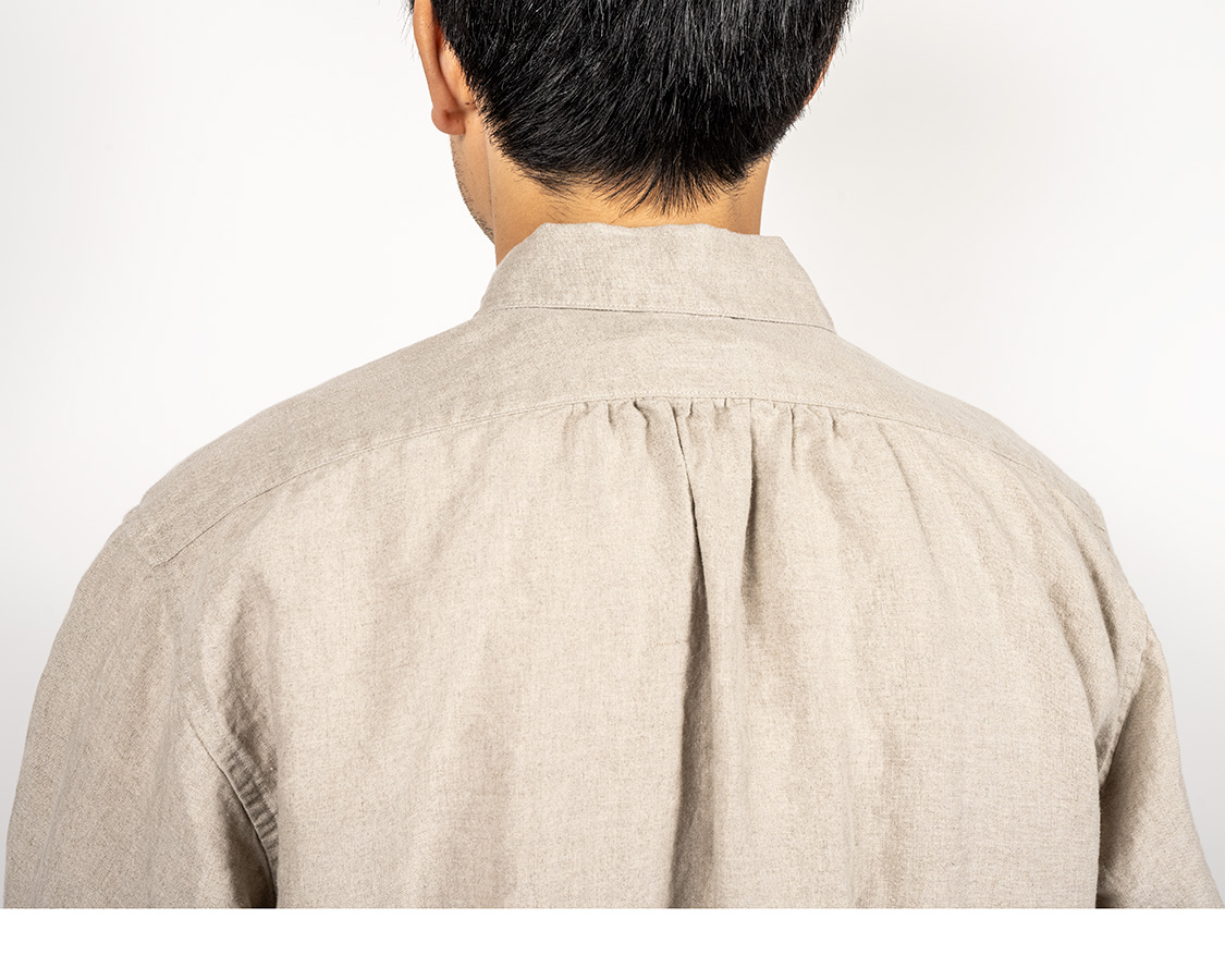 背面の真ん中に細かなシャーリング。もっと現代的なボタンダウンならタックにするだろうし、ワークシャツなら身頃にゆとりを出してタックは無しにする。そこをあえてシャーリングにしていると「クラシックなドレスシャツの名残」を感じる部分。