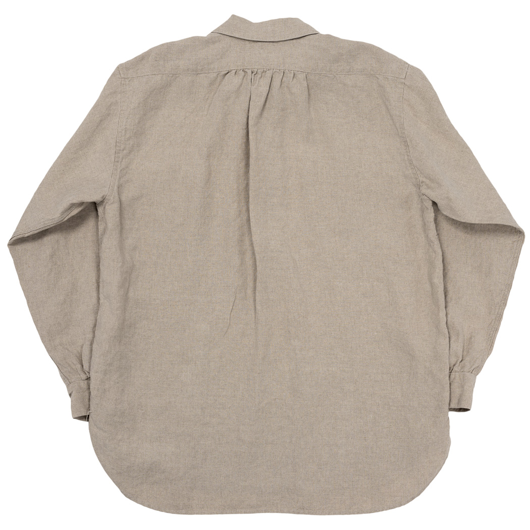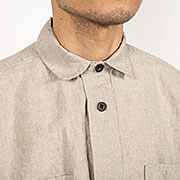 素材、リネン2 色はWORKERS定番の5.5 オンス。通年着られる厚み。生地洗い、揉みを何回も行い、リネンで起こり がちなチクチク感をほぼ完全に取り除いています。でもしっかり、リネンらしいプルプルした腰があるのは元がある程度厚い生地だから。