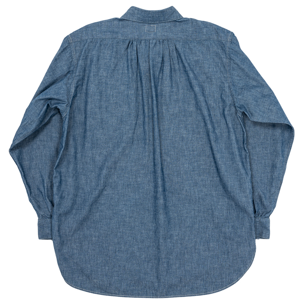 背面、センターに細かいヒダ状のシャーリング。もっと完成された年代のワークシャツは身幅がそもそもゆったり取られ、背面にシャーリングやタックはありませんが、ここはドレスシャツの雰囲気を残して。