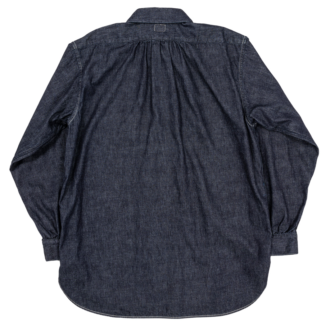 背面、センターに細かいヒダ状のシャーリング。もっと完成された年代のワークシャツは身幅がそもそもゆったり取られ、背面にシャーリングやタックはありませんが、ここはドレスシャツの雰囲気を残して。 |